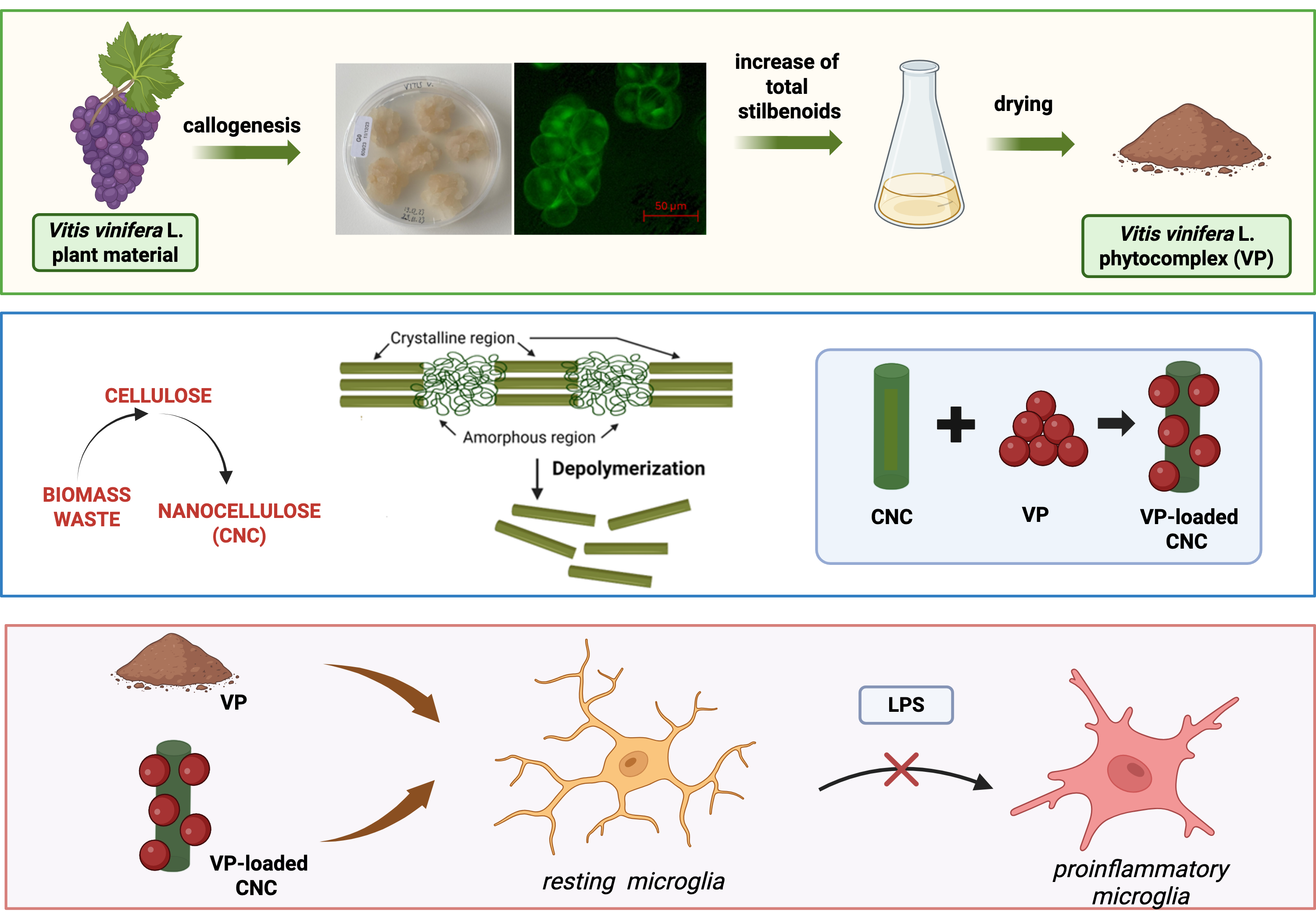 These findings confirm the therapeutic potential of V. vinifera L. as an anti-neuroinflammatory intervention, underscore the value of plant cell culture technology for producing standardized and reproducible phytocomplexes, and highlight nanocellulose as a safe and innovative delivery system. Overall, our results support biotechnology-driven strategies to improve the consistency and efficacy of natural products for potential clinical applications in neuroinflammatory and neurodegenerative conditions.