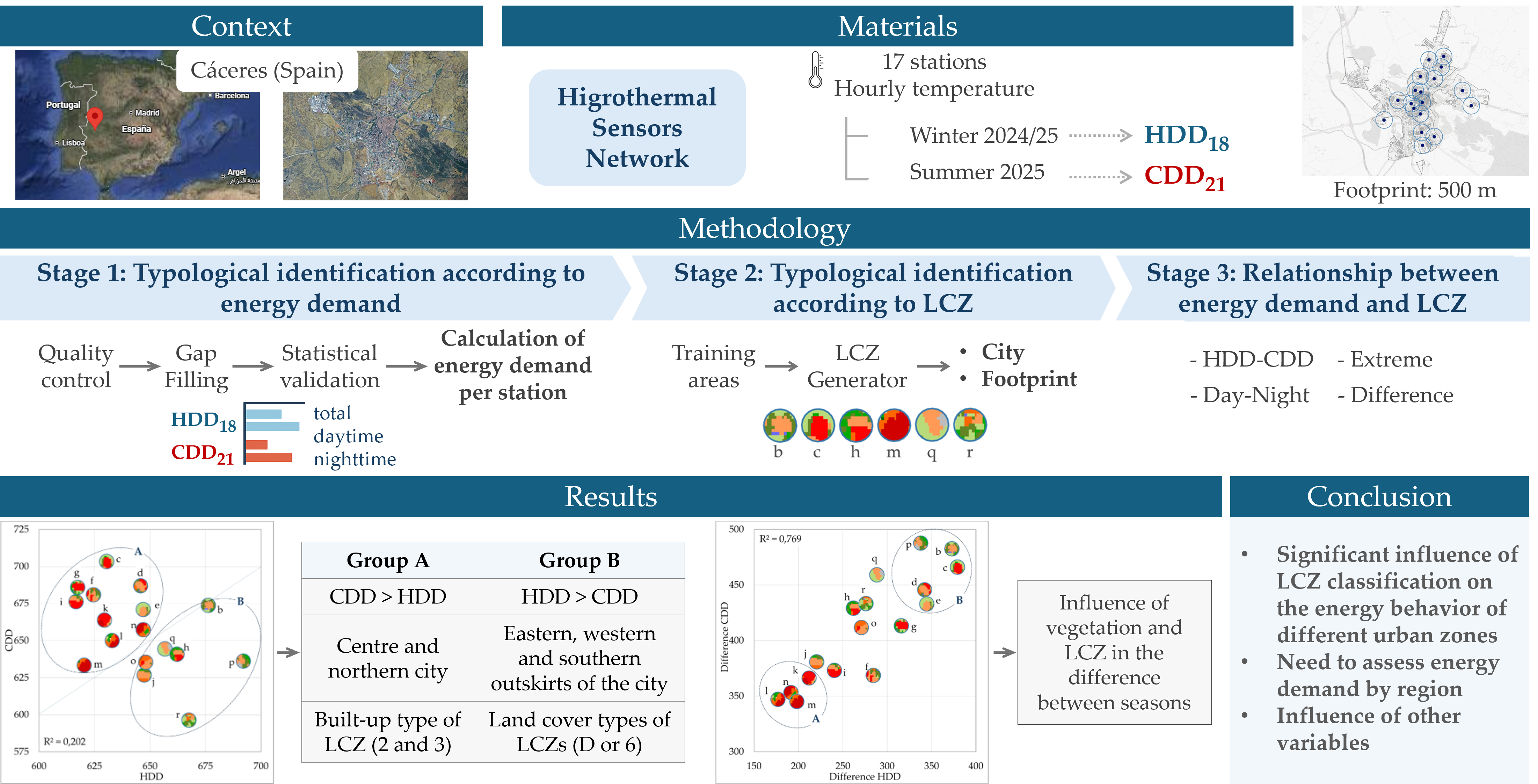 The thermal influence of Urban Heat Islands (UHIs) is not limited to periods of high temperature but persists throughout the year. The present study utilises hourly data collected over a period of one year from a network of hygrothermal monitoring stations with a high density, which were deployed across the city of Cáceres (Spain). The network was designed in accordance with the World Meteorological Organization's guidelines for urban measurements (employing radiation footprints and surface roughness) and ensures representation of each Local Climate Zone (LCZ), characterised by those factors (such as building typology and density, urban fabric, vegetation, and anthropogenic activity, among others) that influence potential solar radiation absorption. The magnitude of the heat island effect in this city has been determined to be approximately 7 °C in summer and winter at the first hours of the morning. In order to assess the energy impact of UHIs, Cooling and Heating Degree Days (CDD & HDD) were calculated for both summer and winter periods across the different LCZs. Following the implementation of rigorous quality control procedures and the utilisation of gap-filling techniques, the analysis yielded discrepancies in energy demand of up to 10% between LCZs within the city. The significance of incorporating UHIs into the design of building envelopes and climate control systems is underscored by these findings, with the potential to enhance both energy efficiency and occupant thermal comfort. This meth-odology is particularly relevant for extrapolation to larger and denser urban environments, where the intensification of UHI effects exerts a direct impact on energy consumption and costs. The following essay will provide a comprehensive overview of the relevant literature on the subject.