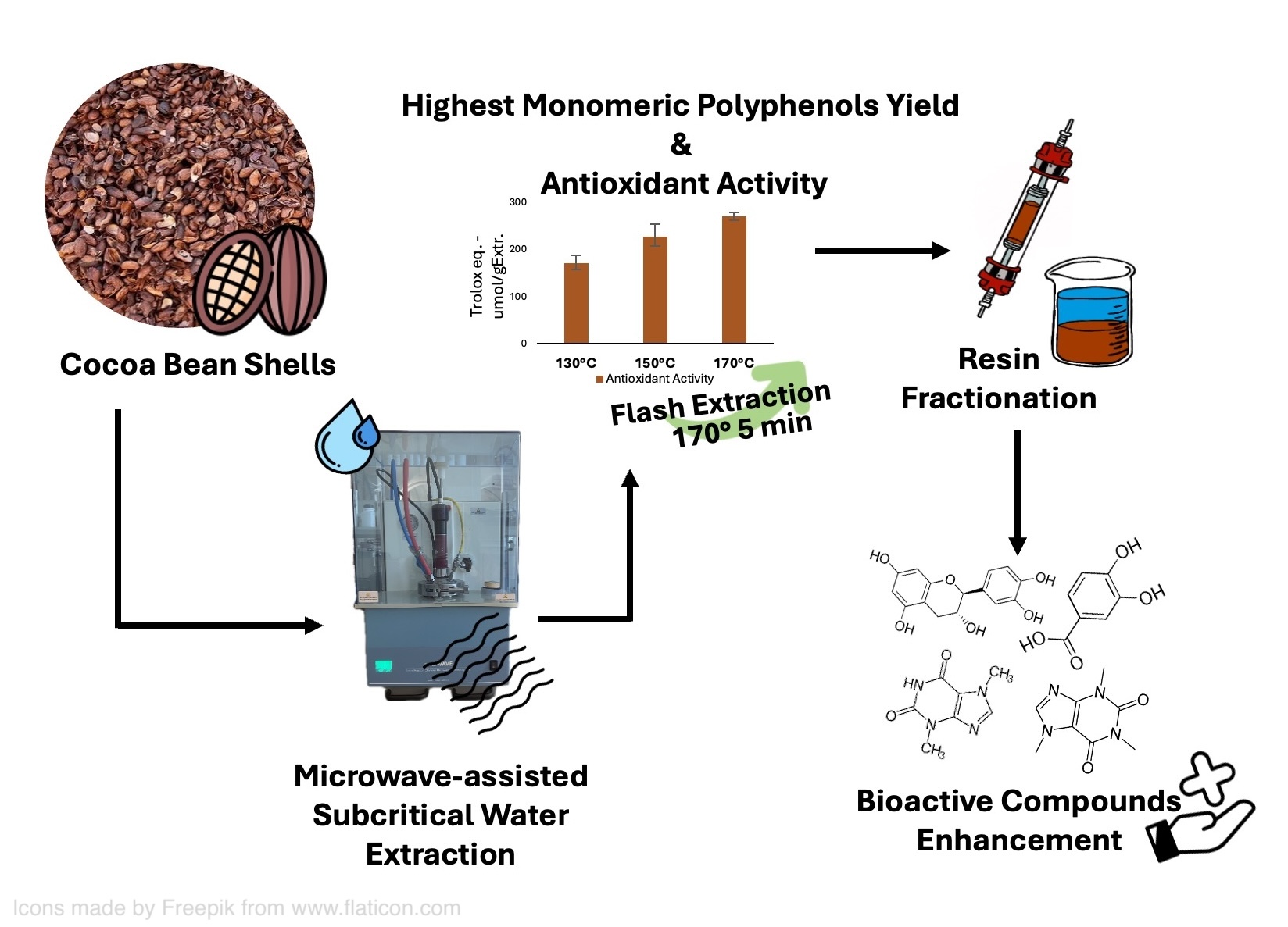The present study investigates Microwave-Assisted Subcritical Water Extraction (MASWE) as a green and fast technique to recover bioactive compounds from CBS. A flash extraction (five minutes) at 170°C yielded a maximum of 45.79 mg of gallic acid equiva-lents (GAE) per gram of CBS, which was higher than that obtained using conventional conditions (25.73 mgGAE/gCBS with 50% acetone solution). Additionally, the HPLC pro-file of the extract from MASWE revealed a significant increase in hydroxybenzoic acids and catechin, compared to the conventional extract.