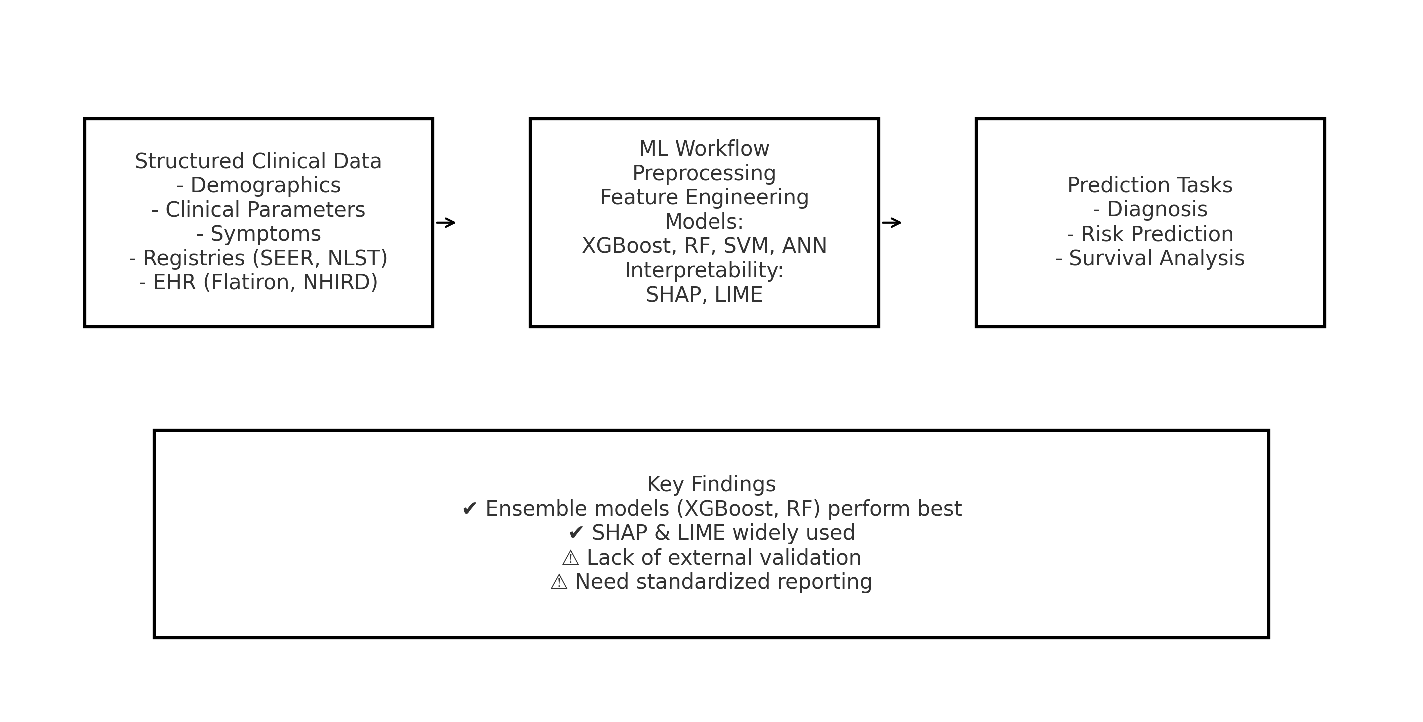 Scope of this review: This review examines peer-reviewed studies that develop or evaluate machine learning models for lung cancer prediction using structured (tabular) data. The included studies are focused on three distinct tasks: (1) Diagnosis prediction – identifying the presence of lung cancer; (2) Risk prediction – estimating an individual’s future likelihood of developing lung cancer; and (3) Survival prediction – forecasting patient outcomes such as survival time or mortality. Studies that incorporate imaging-derived or genomic features are included only if these features are integrated into a structured, tabular format alongside clinical data.