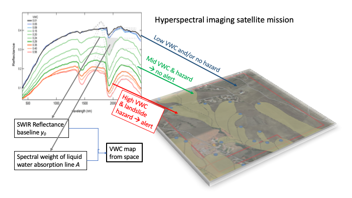 Emerging landslides and severe floods highlight the urgent need to analyse and support predictive models and early warning systems. Soil moisture is a crucial parameter and it can now be determined from space with resolution of few tens of meters, potentially leading to a continuous global monitoring of landslide risk. We address this issue by determining the volumetric water content (VWC) of a testbed in Southern Italy (bare soil with significant flood and landslide hazard) through the comparison of two different satellite observations on the same day. In the first observation (Sentinel-1 mission of the European Space Agency, C-band Synthetic Aperture Radar (SAR)), the back-scattered radar signal is used to determine the VWC from the dielectric constant in the microwave range, also using a time-series approach to calibrate the algorithm. In the second observation (hyperspectral PRISMA mission of the Italian Space Agency), the short-wave infrared (SWIR) reflectance spectra are used to calculate the VWC from the spectral weight of a vibrational absorption line of liquid water (wavelengths 1800−1950nm). As the main result, we obtained a Pearson’s correlation coefficient of 0.4 between the VWC values measured with the two techniques and a separate ground-truth confirmation of absolute VWC values in the range 0.10−0.30 within ±0.05. This overlap validates that both SAR and hyperspectral data can be well calibrated and mapped with 30 meter ground resolution - given the absence of artifacts or anomalies in this particular testbed (e.g. vegetation canopy or cloud presence). If hyperspectral data in the SWIR range become more broadly available in the future, our systematic procedure to synchronise these two technologies in both space and time can be further adapted to cross-validate the global high-resolution soil moisture dataset. Ultimately, multi-mission data integration could lead to quasi-real time hydrogeological risk monitoring from space.