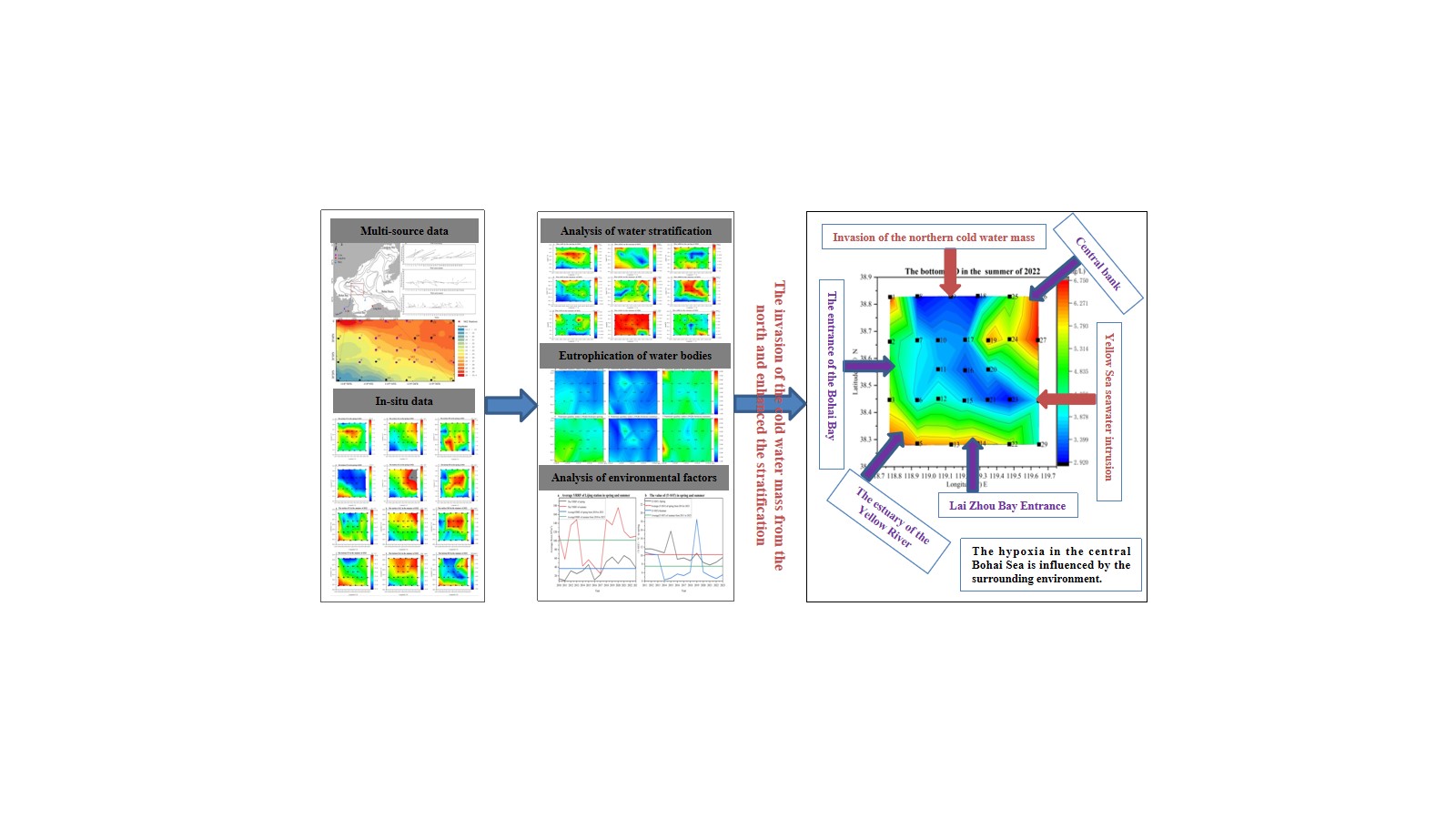 To examine the occurrence mechanisms of hypoxia in the central BS, we set up 29 stations in the cold-water mass areas in the southern part of the central BS in 2022 to analyze seasonal variation in DO and stratification factors. We focused on analyzing the distribution characteristics of hypoxia in summer, exploring its influencing factors and the cause of the phenomenon. Our analysis provides data and methodological support for protecting the wintering grounds of the distribution centers for the migratory movement of economically important fish, shrimp, and crabs in the Yellow Sea and BS.