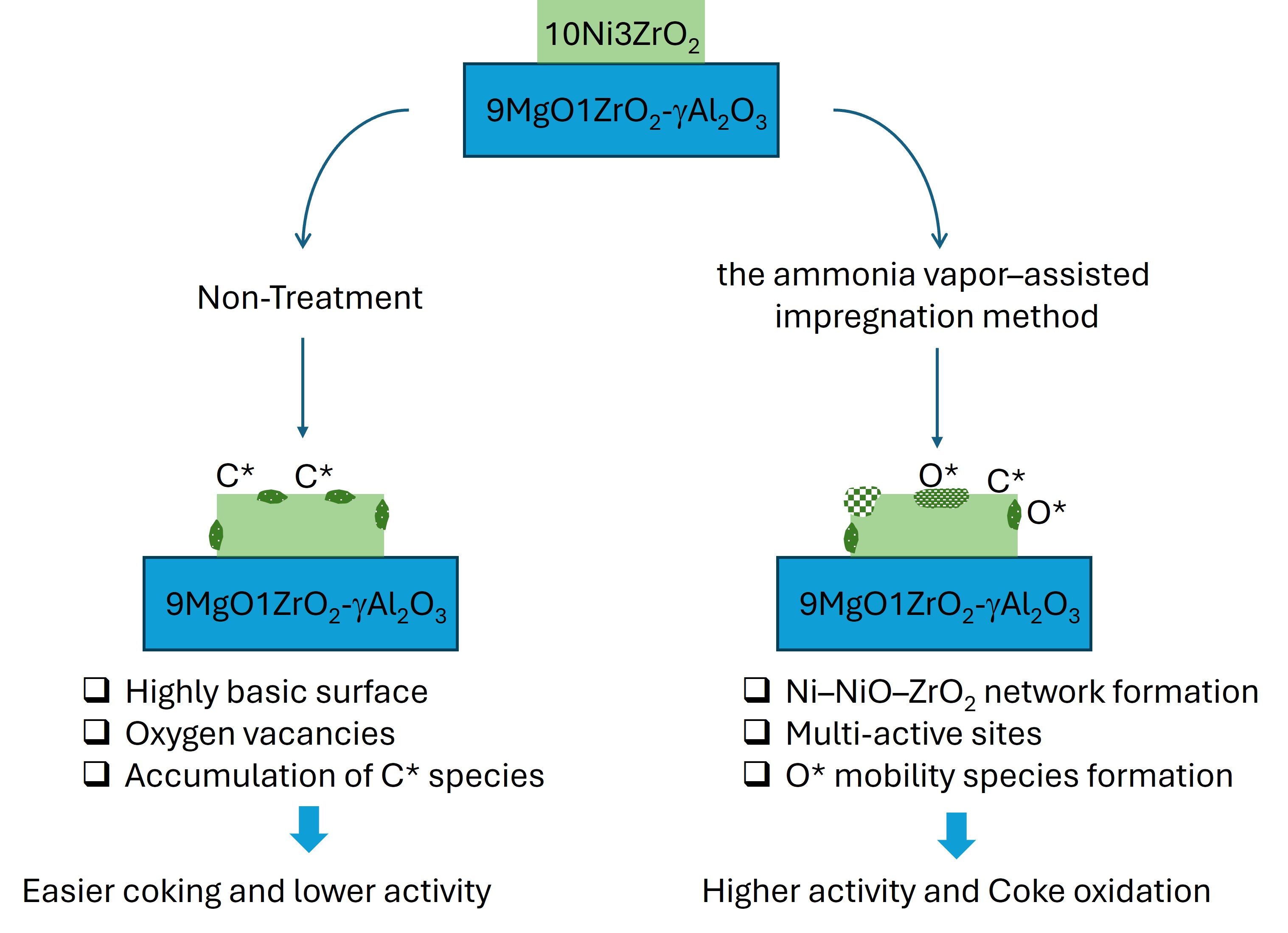 This study investigates the development of Ni-based catalysts for low-temperature dry methane reforming (DMR) at 550 °C. The catalysts were prepared by dispersing Ni on γ-Al2O3 modified with 9 wt% MgO and 1 wt% ZrO2, while 10 wt% Ni–x wt% ZrO2 promoters (0, 1, and 3 wt%) were introduced using the incipient wetness impregnation method. A Ni–NiO–ZrO2 surface network was generated on the 10 wt% Ni–3 wt% ZrO2 catalyst via an ammonia vapor–assisted impregnation route. The ZrO2 promoter strengthened the metal–support interaction, which increased the total amount of reducible Ni while shifting the reduction to higher temperatures. This modification also promoted CO2 activation relative to CH4, thereby enhancing the RWGS pathway and lowering the H2/CO ratio. In contrast, the Ni–NiO–ZrO2 network formed through the ammonia-assisted method increased the concentration of surface-accessible Ni, reduced excessive coverage by ZrO2, and significantly improved oxygen mobility. These features facilitated continuous oxygen transfer, enhanced coke oxidation, and ensured a more balanced activation of both reactants. Overall, the combined structural and functional synergies achieved through promoter optimization and the ammonia vapor–assisted preparation method resulted in superior catalytic activity and selectivity for DMR at 550 °C.