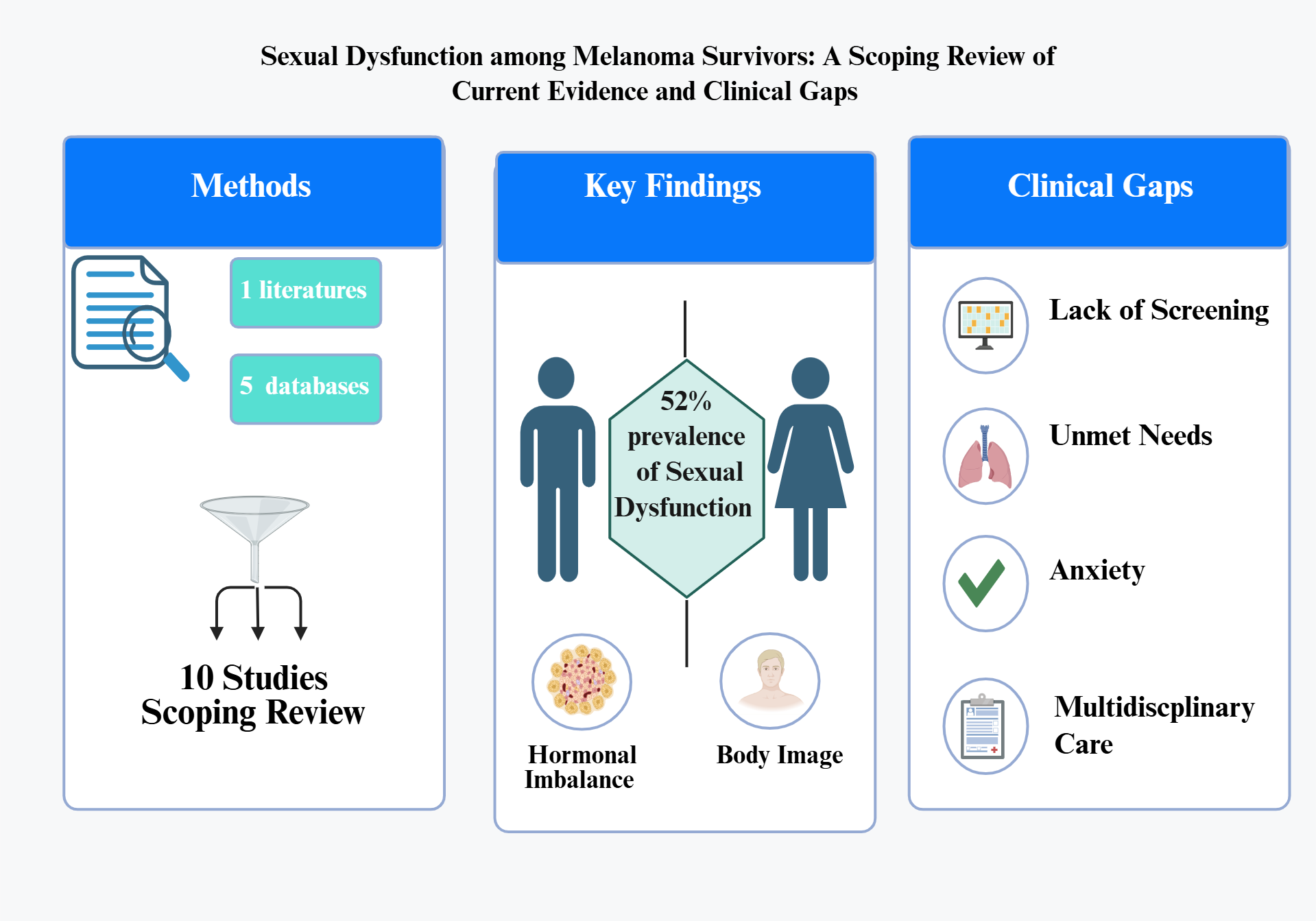 To strengthen the evidence base, future studies should adopt longitudinal designs to clarify temporal associations and better delineate causal pathways. In addition, interventional research is critically needed to address the paucity of evidence regarding effective management strategies. Such trials should evaluate the impact of targeted psychosocial, pharmacologic, and rehabilitative interventions on sexual health outcomes. Importantly, standardized assessments of sexual function should be incorporated routinely into melanoma clinical trials, particularly those involving immunotherapies, where endocrine toxicities may impair sexual functions. Collectively, these strategies will advance a more robust and clinically actionable understanding of sexual dysfunction in melanoma populations.