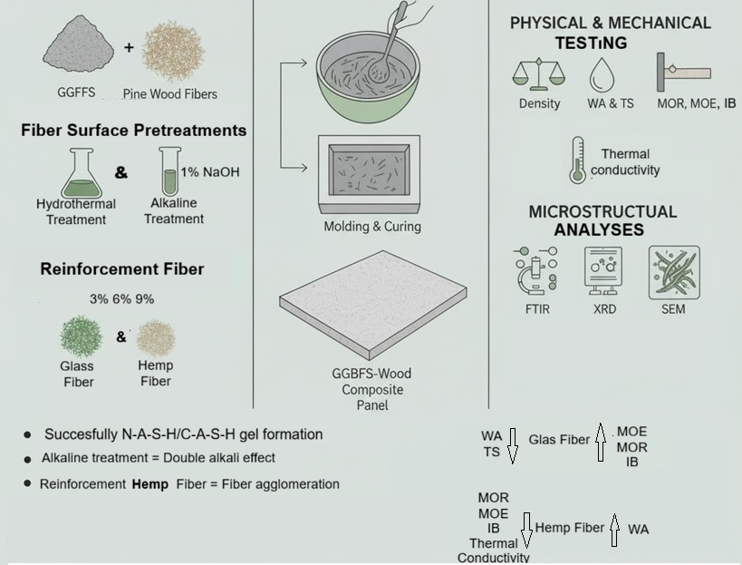 Despite these advancements, a significant gap remains. Most studies focus on fly ash or metakaolin systems reinforced with synthetic fibers. There is a scarcity of in-depth research on the interaction between natural/waste fibers and 100% GGBFS-based geopolymers—an industrial byproduct with unique reaction kinetics. This study addresses this gap by engineering a fully waste-derived, sustainable geopolymer panel. The core objective is to determine optimal curing conditions for a 100% slag-based matrix and systematically evaluate the effects of glass and hemp fiber additions (3%, 6%, 9%) on its physico-mechanical properties, thereby valorizing local byproducts for carbon-neutral construction.