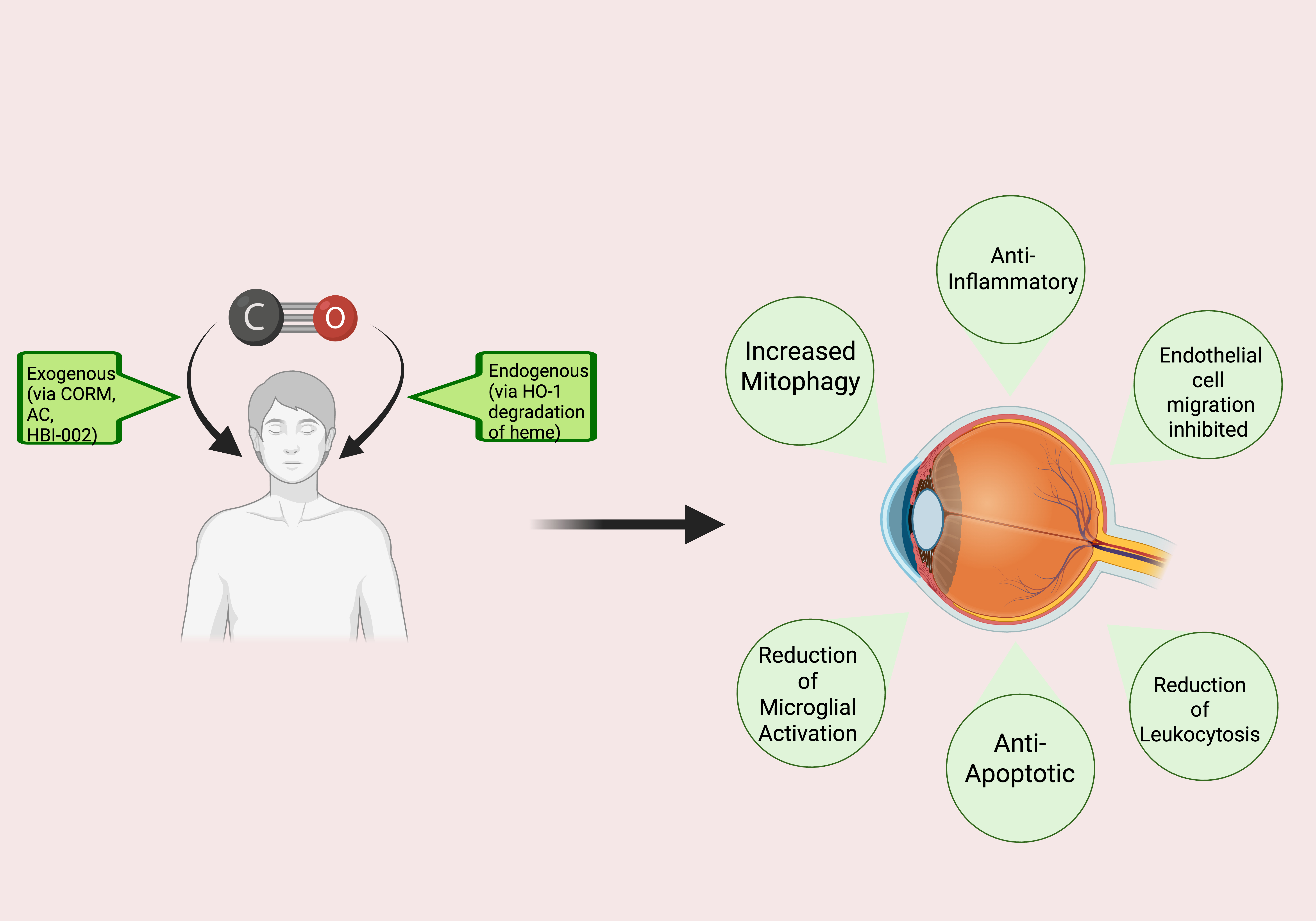 The benefits of CO therapy have also been realized in the eye, where the impact of CO therapy has mainly been cytoprotective. Indeed, many ocular disease models have been used to study the effects of CO. The most common model is the rodent model of ocular ischemia-reperfusion injury (IRI). IRI occurs when the blood supply to a tissue, such as the retina, is inadequate; thus, the metabolic and oxygen needs of the tissue are not met [