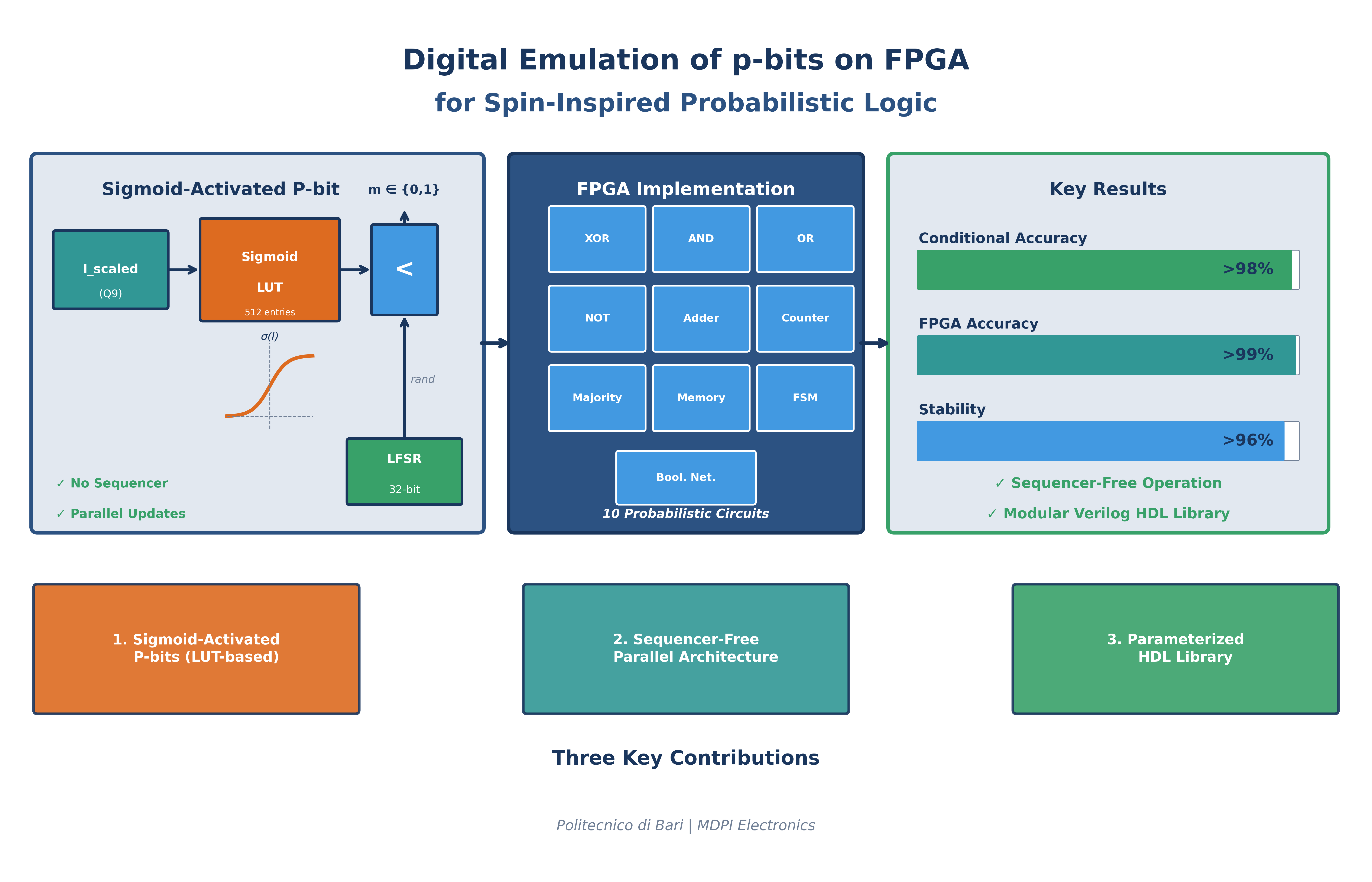 23] formally introduced weighted p-bits for scalable FPGA-based probabilistic circuits (p-circuits). Their contribution, later contextualized and reinforced by the broader architectural vision of interconnected p-units described by Camsari et al. [
