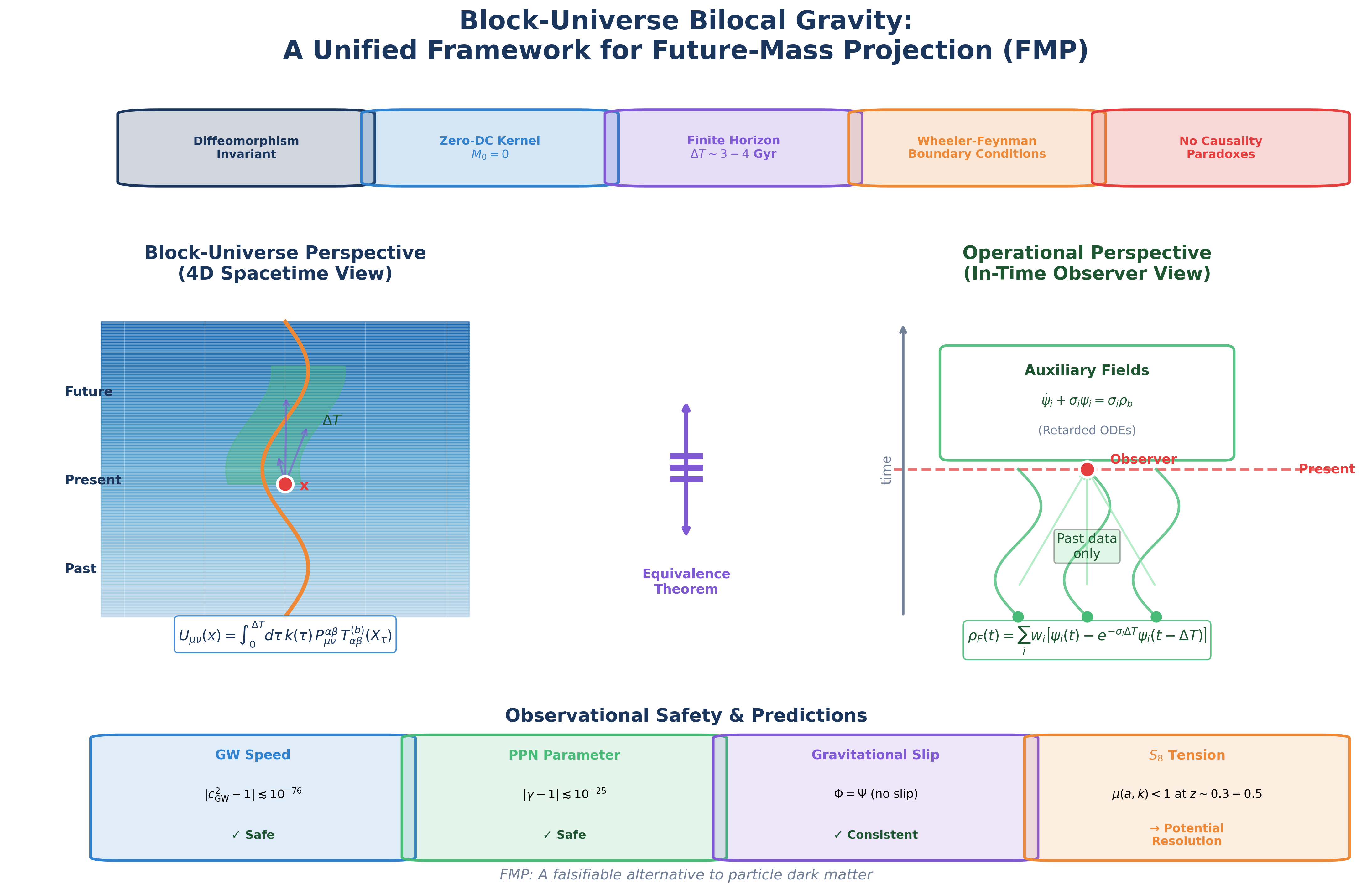 Block-Universe (God’s-Eye) Perspective: In general relativity, spacetime is a four-dimensional manifold where past, present, and future coexist as a unified geometric structure. From this global viewpoint, the entire baryonic history is a single 4D object. The FMP modification is defined as a covariant bilocal functional of this object, with the kernel having support in a finite future domain. This perspective is mathematically clean and manifestly covariant.