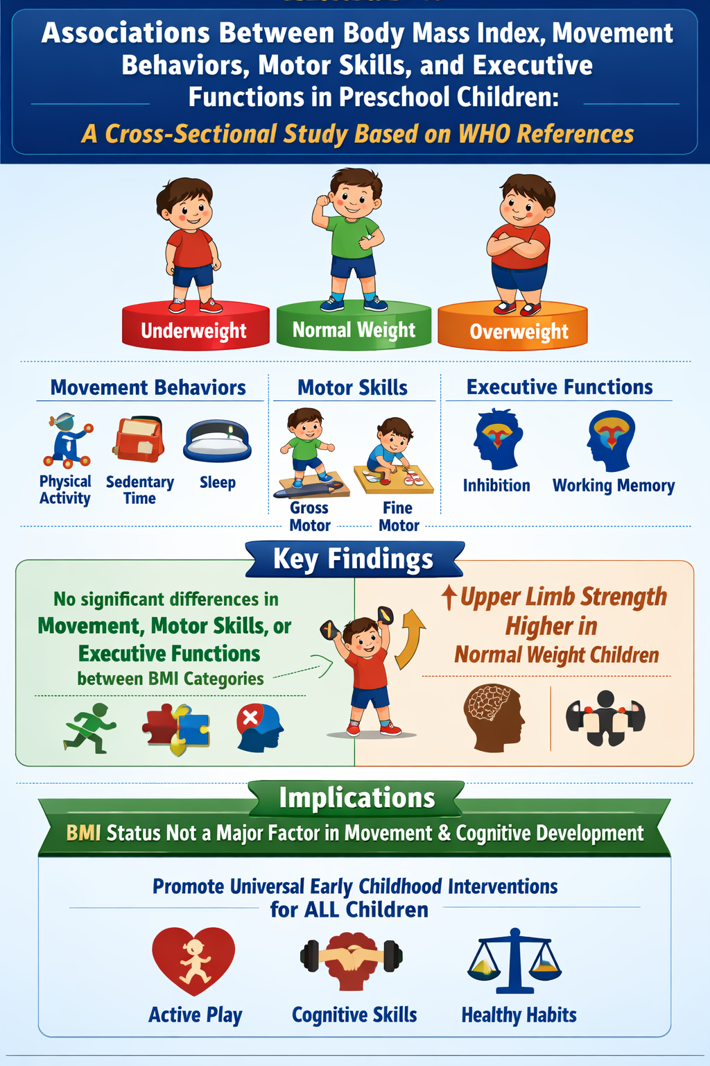 Background: Early childhood represents a key stage for the development of movement behaviors (MV), motor skills (MS), and executive functions (EF). Body Mass Index (BMI), defined according to World Health Organization (WHO) references, may influence these domains early in life. In this context, this cross-sectional observational study aimed to examine the associations between BMI and 24-hour MV, MS, and EF in Tunisian preschool children aged 4 to 5 years. Methods: This cross-sectional observational study included 112 Tunisian children aged 4 to 5 years (50 boys, 62 girls), recruited from kindergartens in urban and rural areas. Anthropometric measurements were used to calculate age-specific BMI z-scores and classify children into three BMI categories: below normal, normal, and above normal. 24-hour MV (physical activity (PA), sedentary behavior, and sleep) were objectively assessed using accelerometry over five consecutive days. EF (inhibition and working memory) were assessed using standardized cognitive tests, gross MS were evaluated using the Supine Timed Up and Go test (functional mobility), One-Leg Standing Balance test (postural steadiness), Hand Grip Dynamometer (upper body strength), and Standing Long Jump (lower body strength), and fine MS were assessed using the 9-Hole Pegboard Test (dexterity). All tools are validated and standardized for children. Results: Significant differences between BMI categories were observed for anthropometric variables (p < 0.05). In contrast, no significant differences were found for 24-hour MV, adherence to recommendations, EF, or most MS (p > 0.05). Only upper limb strength showed a significant difference (p = 0.035), with children of normal BMI showing slightly higher strength than those with above-normal BMI. Conclusion: In Tunisian preschool children, weight status is primarily associated with differences in physical growth, with no marked relationship to MV, EF, or MS. These findings highlight the importance of universal preventive interventions starting in early childhood.