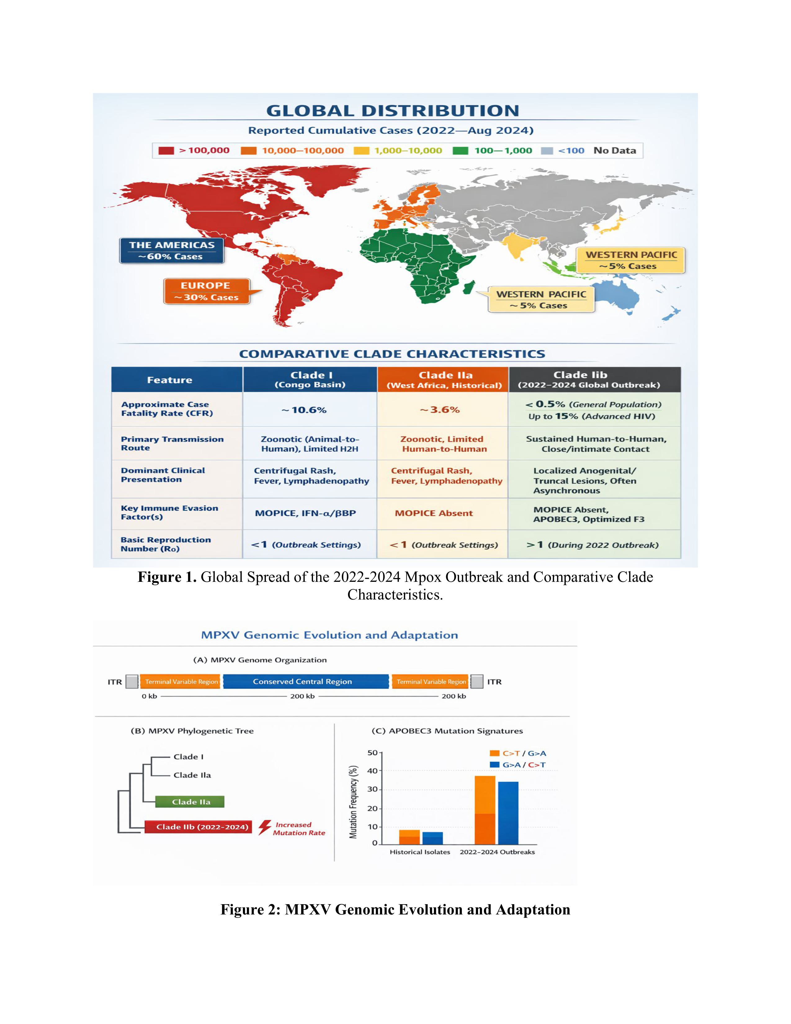 Figure 1. Global Spread of the 2022-2024 Mpox Outbreak and Comparative Clade Characteristics.