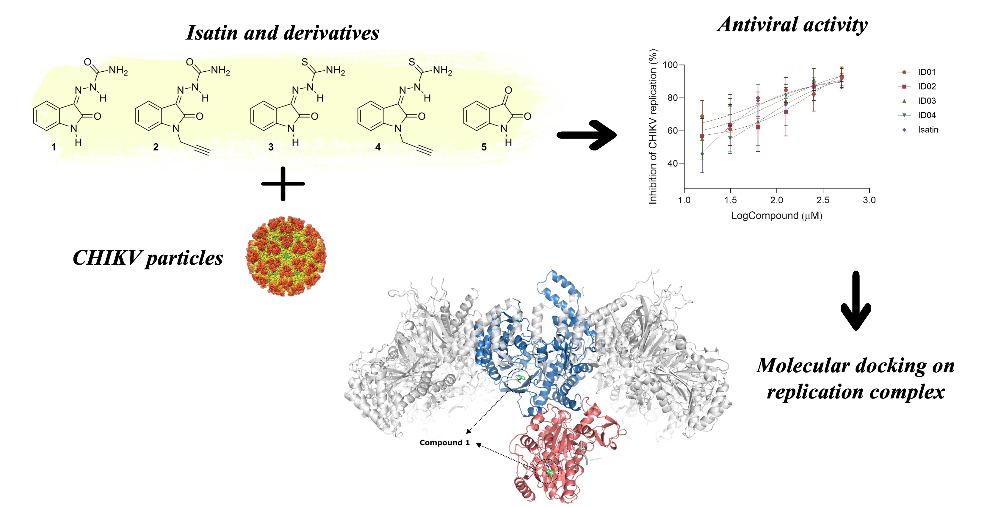Chikungunya virus (CHIKV), a re-emerging arbovirus of the Alphavirus genus, causes acute febrile illness often followed by persistent polyarthritis or arthralgia. Due to its rapid transmission and the absence of approved antivirals or licensed vaccines, there is an urgent need for effective therapeutic strategies. Among potential antiviral targets, the nonstructural proteins nsP2 (a helicase/protease) and nsP4 (an RNA-dependent RNA polymerase) are essential for viral replication. In this study, we evaluated five compounds based on the isatin scaffold: one parent isatin molecule and four synthetic derivatives (ID11–ID14) functionalized with semicarbazone or thiosemicarbazone groups. Cytotoxicity assays confirmed low toxicity for all compounds, with CC₅₀ values above 500 µM. Using a CHIKV replicon model in BHK-CHIKV-NCT cells, compounds ID13 and ID14 significantly reduced EGFP fluorescence, indicating strong inhibition of viral replication. Infectious particle assays supported these results, with all compounds displaying dose-dependent antiviral effects and EC₅₀ values between 20 and 33.6 µM. No significant reduction in viral entry was observed in entry inhibition assays, suggesting that the compounds act post-entry by targeting replication. Molecular docking simulations revealed a predicted propensity of all compounds to interact with important residues of nsP2 and nsP4. Notably, compound ID14 showed the strongest predicted affinity for both enzymes, while compound ID13 demonstrated the highest antiviral efficacy in vitro. These findings highlight isatin derivatives as promising candidates for CHIKV antiviral development and support further exploration of dual-target strategies focusing on viral replication proteins.