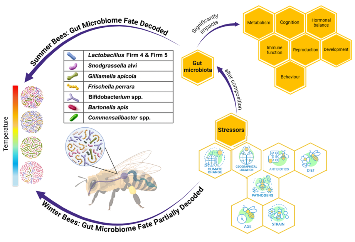 Climate change is making winters in temperate regions increasingly harsh and unpredictable, posing significant threats to honey bee (Apis mellifera) health. The gut microbiome, a distinct community of core bacterial species, is central to overwintering success by supporting immune function, nutrient assimilation, and pathogen resistance, but is highly sensitive to environmental stressors such as cold temperatures and dietary shifts. Stress-induced perturbations can reshape the composition and relative abundance of the gut microbiome in honey bees, leading to adverse effects on host health, physiological functions, and overwinter survival. Cold temperatures and additional stressors further destabilize the microbiome, compounding these effects. This review is the first to synthesize current knowledge on how extrinsic factors, such as diet, antibiotics, and pathogens, and intrinsic factors, including age and strain, influence the composition and function of the honey bee gut microbiota. Given the increasing severity of winter conditions under climate change, a deeper understanding of microbiome–host–environment interactions is essential for improving honey bee resilience. By integrating evidence on the microbiome’s roles in nutrient utilization, immune modulation, and pathogen defense, this review out-lines a framework to guide future research and management strategies aimed at mitigating overwintering losses and sustaining pollinator health in a changing global climate.