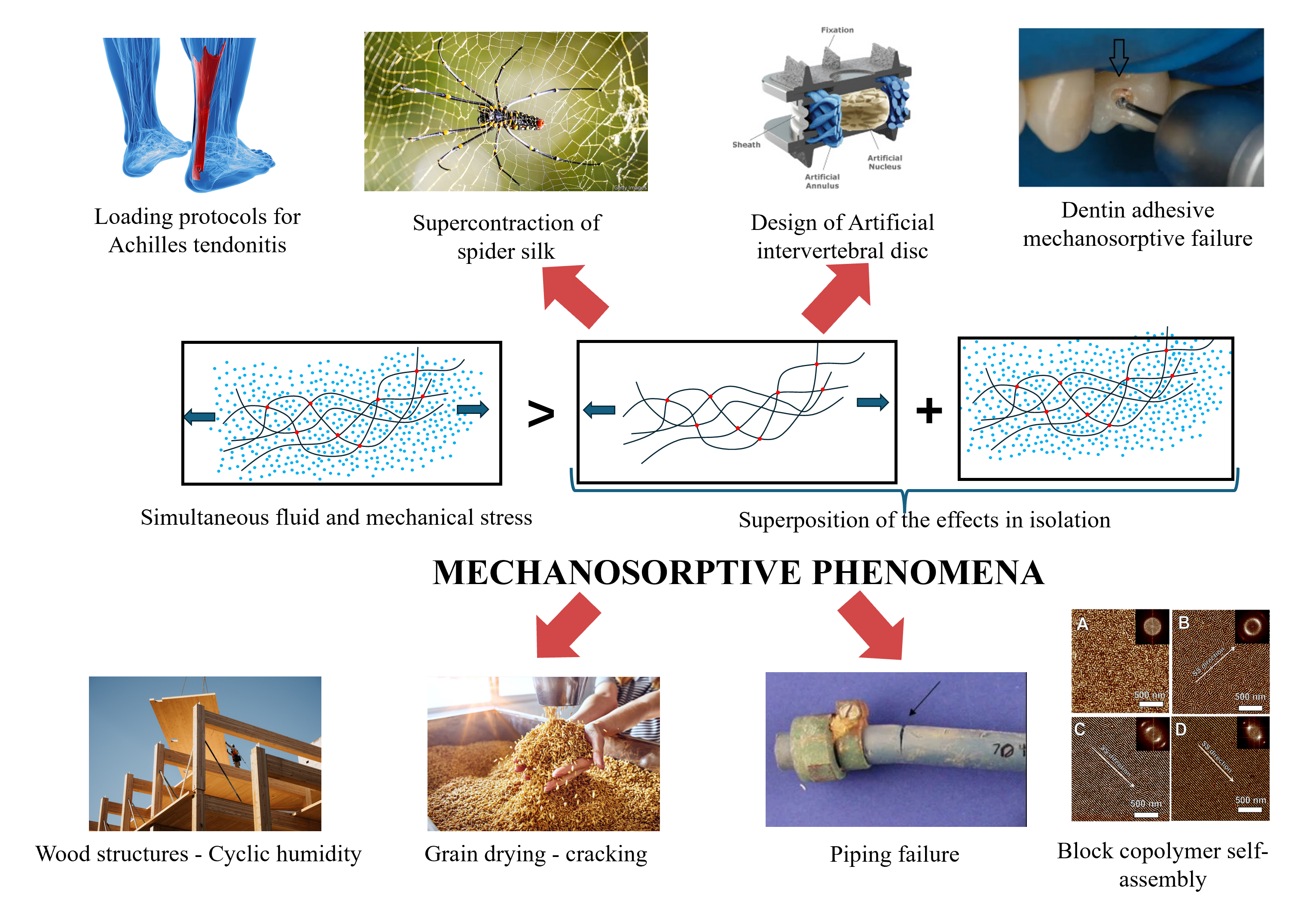 Mechano-sorptive phenomena (MSP) refer to the coupled mechanical response of polymers under simultaneous mechanical stress and fluid sorption. The most researched MSP are environmental stress cracking (ESC) and mechano-sorptive creep (MSC). ESC initiates at regions of localized stress and solvent sorption, presenting as brittle fracture, while MSC is characterized by large, time-dependent, and partially recoverable creep associated with transient bulk sorption. ESC experiments can however also result in significant plastic deformation, in which case the term environmental stress yielding (ESY) has been used. Similarly, MSC can evolve into tertiary creep followed by rupture, in which case the phenomenon is termed mechano-sorptive creep rupture (MSCR). Both behaviors originate from solvent diffusion into the amorphous phase leading to disruption of non-covalent interactions between polymer chains. This review bridges seemingly disconnected research to illustrate that ESC and MSC represent extremes on a continuum of MSP, rather than disparate phenomena. We identify the principles of polymer thermodynamics and experimental methods necessary to separate polymer deformation under MSC into reversible stress-induced swelling and irreversible non-equilibrium deformation. We propose that a better understanding of these phenomena is necessary for a variety of applications including biomimetic materials that mimic the mechanical adaptability of marine organisms.