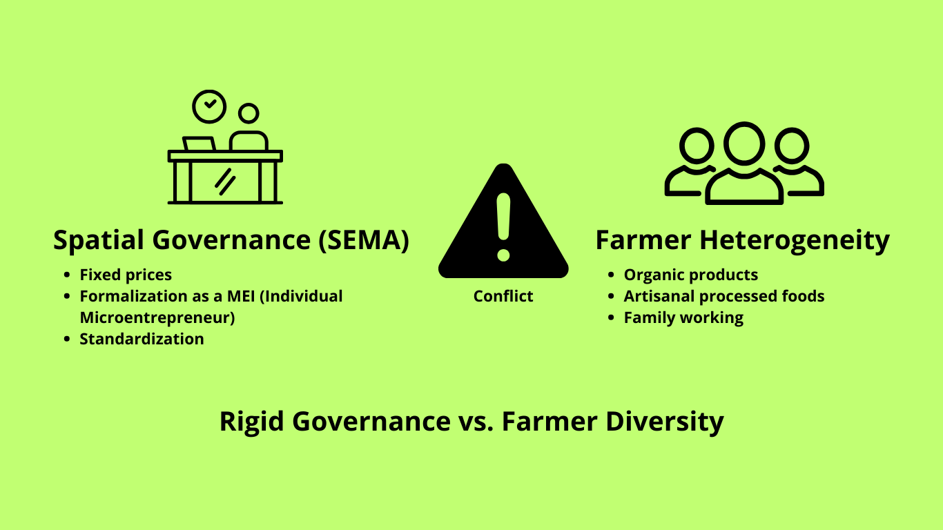 In Brazil, municipal open-air markets (varejões) have become key spaces where rural-urban transitions unfold, not as a linear process of urban encroachment, but as a contested terrain of heterogeneous livelihood strategies, institutional regulation, and everyday agency. Based on 25 in-depth interviews with small-scale farmers and vendors in Piracicaba (SP), this study examines how spatial governance, exercised by the Municipal Secretariat of Agriculture and Food Supply (SEMA), interacts with the realities of peri-urban producers who rely on direct sales to urban consumers. While SEMA’s interventions (e.g., fixed pricing, MEI formalization, standardized infrastructure) aim to “modernize” market operations, they often overlook the diversity of production logics, particularly among organic farmers, family-based producers, and mixed vendors. Farmers report that rigid price controls ignore rising input costs, technical assistance remains generic or absent, and bureaucratic requirements fail to recognize informal yet functional modes of cooperation and value creation. Crucially, “feirantes” (smallholder farmers and resellers who sell agricultural products at open-air markets) are not passive recipients of policy; they actively reinterpret, adapt, and reshape governance through diversification (e.g., organic production, minimally processed goods), informal cooperatives, direct sales networks, and the redefinition of agricultural work as both economic necessity and cultural identity. The paper argues that spatial governance in Piracicaba is neither a success nor a failure, but a continuously negotiated process, contested and co-produced through the agency of those it seeks to regulate. This case reveals a distinctly Brazilian modality of rural-urban transition, where agricultural livelihoods persist not through top-down planning, but through the resilience, creativity, and collective negotiation of small producers navigating the gaps between policy design and lived reality.
