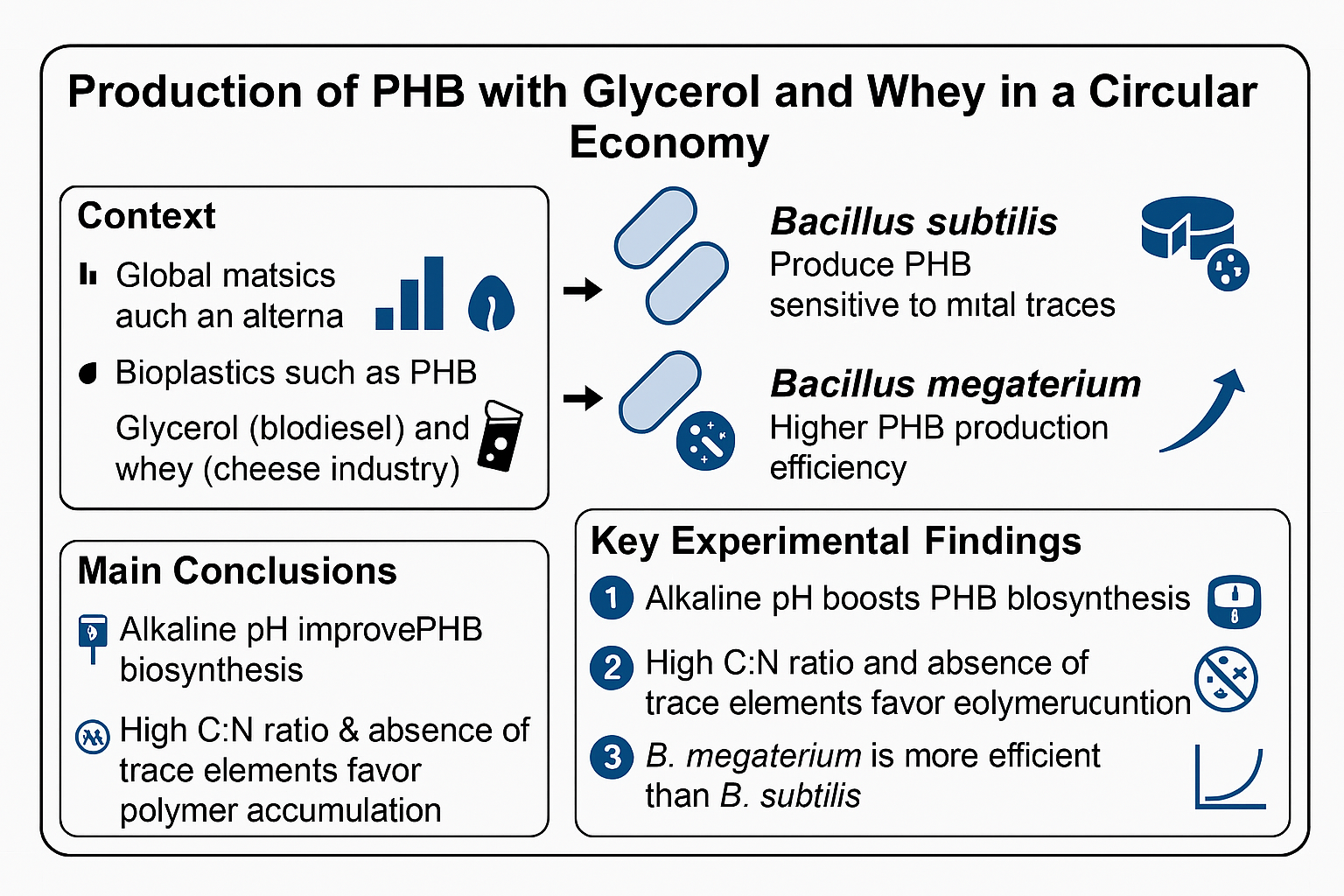 This study shows the technical feasibility of using industrial by-products, especially residual glycerol and cheese whey, in circular economy pathways to produce polyhydroxybutyrate (PHB) through biochemical methods. Based on the experimental results, the following conclusions can be made: