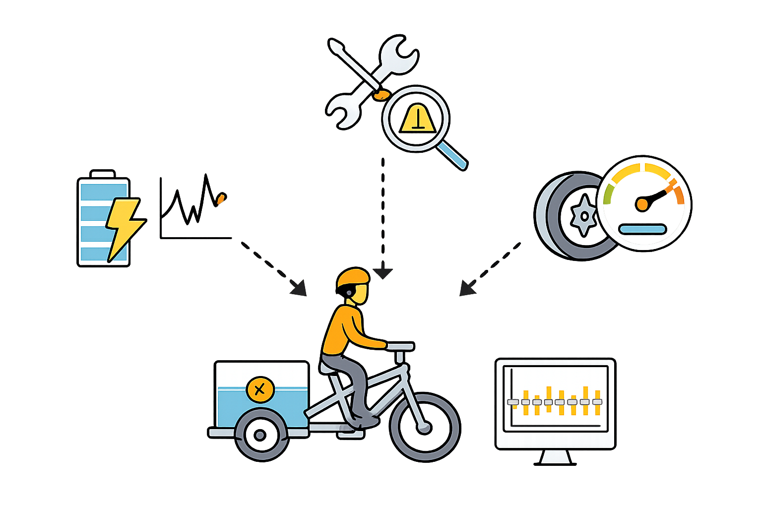 Urban last-mile logistics is increasingly served by light electric micro-mobility vehicles, whose high-variability duty cycles accelerate heterogeneous degradation and intermittent faults. This study presents a reproducible, data-centric workflow for predictive maintenance using public sensor datasets and addresses 3 complementary tasks: (i) battery ageing prognostics via State-of-Health (SoH) trajectory forecasting, (ii) multi-class fault diagnosis from propulsion/thermal telemetry, and (iii) tyre-pressure–aware energy-consumption modelling. Battery ageing was analysed using the NASA Prognostics Center of Excellence dataset of 4 Li-ion 18650 cells (B0005, B0006, B0007, B0018). After cleaning and smoothing charge-phase records, an LSTM model (50 hidden units, 35 epochs, batch size 256, shuffle=False) tracked measured capacity fade with stable convergence; removing normalization produced a small reported degradation (average error increase of 0.3%). A degree-2 polynomial regression baseline captured the global decay trend but generalized less effectively (test R² = 0.6861, test MAE = 0.0274). For fault diagnosis on the “New Energy Vehicles Diagnosis” dataset, Random Forest achieved the highest test performance (accuracy 0.899, macro-F1 0.900, macro-AUC 0.985), followed by SVM (RBF) and logistic regression. For energy consumption regression including tyre pressure, linear regression showed consistent generalization (test R² = 0.9474, test MSE = 0.2528) under nominal pressure conditions (≈ 28–35 psi). Overall, the results indicate that task-appropriate model selection and disciplined preprocessing can yield reliable, interpretable predictive signals for maintenance planning in micro-mobility contexts.