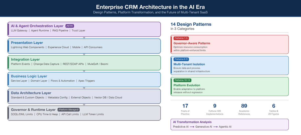 Enterprise Customer Relationship Management (CRM) platforms have evolved from simple contact databases into complex, multi-tenant cloud ecosystems that serve as the operational backbone for Fortune 500 organizations. Despite this criticality, no unified reference framework exists that catalogues the architecture and design patterns specifically adapted for constrained multi-tenant CRM environments, nor examines how the rapid integration of artificial intelligence is reshaping these architectural foundations. This paper presents a practitioner-driven reference framework comprising 14 architecture and design patterns organized across four layers — Data Architecture, Business Logic, Integration, and Presentation — derived from longitudinal analysis of enterprise CRM implementations spanning 17 years across financial services, telecommunications, healthcare, energy, and consumer goods sectors. We identify three categories of patterns: (1) Governor-Aware Patterns that optimize resource consumption within platform-enforced execution limits; (2) Multi-Tenant Isolation Patterns that ensure data and process separation in shared infrastructure; and (3) Platform Evolution Patterns that enable applications to adapt to platform releases without regression. Beyond the foundational pattern catalogue, we analyze the AI transformation reshaping CRM architecture across three generations — predictive, generative, and agentic AI — documenting how these capabilities introduce new architectural layers (vector databases, knowledge graphs, AI agent orchestration), governance frameworks (Trust Layer, NIST AI RMF), and integration protocols (MCP, A2A). We further examine the provocative question of whether AI coding agents could enable enterprises to bypass CRM platforms entirely by building custom applications, presenting evidence-based analysis of AI developer productivity (including studies showing experienced developers are 19% slower with AI tools on complex codebases), code quality concerns (45% security vulnerability rate in AI-generated code), and seven structural platform advantages that historical precedent confirms have withstood four prior waves of "build your own" disruption. The CRM market continues to accelerate ($128 billion, 13.4% growth) with AI-in-CRM emerging as the fastest-growing subsegment at 28% CAGR, suggesting that AI will transform rather than displace enterprise CRM platforms.