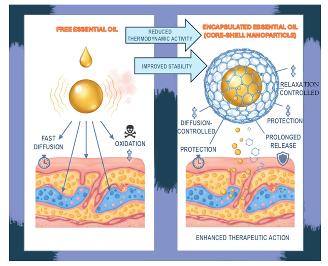 This review examines biodegradable polymer-based core–shell nanoformulations encapsulating essential oils for acne treatment through the lens of physicochemical design and controlled delivery mechanisms. Acne is a common inflammatory skin disorder closely associated with sebum overproduction and microbial imbalance, while conventional therapies, although effective, may present long-term side effects. Increasing attention has therefore turned to sustainable dermatological materials derived from eco-friendly polymers combined with naturally active compounds. Recent advances show that core–shell nanostructures fabricated from biodegradable polymers function as physicochemically engineered carriers for volatile essential oils, enhancing their stability, protecting them from premature degradation, and enabling controlled release governed by diffusion, polymer relaxation, interfacial interactions, and degradation kinetics. The review highlights how polymer chemistry, interfacial properties, particle morphology, and processing routes determine encapsulation efficiency, release profiles, and skin permeation behavior. Particular emphasis is placed on structure–property–function relationships, including mass transport phenomena, thermodynamic compatibility between polymers and essential oils, surface charge, wettability, and nanostructure architecture, which collectively influence bioavailability and therapeutic performance. By integrating concepts from polymer physical chemistry, colloid and interface science, and drug delivery kinetics, these sustainable nanoformulations emerge as promising platforms for acne and sebum control. Overall, essential oil-loaded biodegradable polymeric core–shell systems represent a sustainable and scientifically grounded approach to acne management, although further physicochemical characterization and in vivo validation are required to support clinical translation.