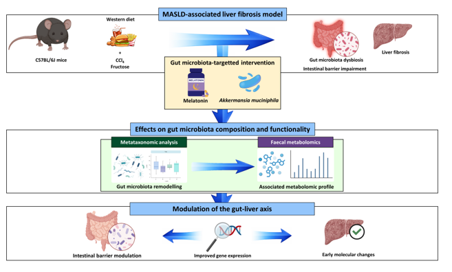 Metabolic dysfunction-associated steatotic liver disease (MASLD) is the most common cause of chronic liver disease worldwide. Fibrosis is the main prognostic factor and the last reversible stage before cirrhosis, yet therapeutic options remain limited. Given the strong contribution of gut dysbiosis to MASLD progression, strategies targeting the gut microbiota are of growing interest. This study aims to evaluate the effect of melatonin, a well-known antioxidant, anti-inflammatory and antifibrotic compound, and Akkermansia muciniphila, a next-generation probiotic, on a MASLD-associated liver fibrosis model. Eight-week-old C57BL/6J mice were fed with control or Western diet supplemented with fructose and intraperitoneal CCl₄ to induce liver fibrosis. After eight weeks, animals received either no intervention, melatonin, A. muciniphila, or both for four weeks. Serum biochemistry, liver histology and gut and liver gene expression were evaluated and multi-omic analyses were performed, including gut microbiota profiling and faecal metabolomics. Statistical analyses assessed intergroup differences and correlations across datasets. Both interventions partially restored gut microbiota composition and functionality and modulated hepatic and intestinal gene expression. Melatonin and A. muciniphila exerted protective effects against MASLD-associated fibrosis, which supports their potential as adjunctive therapeutic strategies to mitigate liver injury through modulation of the gut–liver axis.
