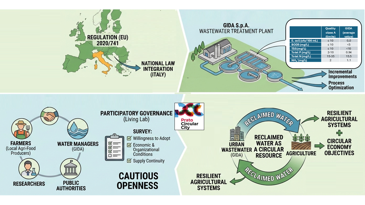 The reuse of treated wastewater for agricultural irrigation is increasingly recognized as a strategic response to the growing challenges posed by climate change and freshwater scarcity. The paper outlines the development of EU regulations on using treated wastewater for irrigation, focusing on Italy. It highlights Regulation (EU) 2020/741, which sets minimum standards and water quality classes for agricultural reuse, and discusses its integration into national law. The aim of the paper is to present a case study of the wastewater treatment plant operated by GIDA S.p.A. in the Municipality of Prato, Tuscany. A quali-quantitative survey was conducted with a sample of local agri-food producers located in proximity to the plant, aimed at assessing their irrigation needs, current water sources, and attitudes toward the use of reclaimed water. Results indicate a general willingness to adopt treated wastewater for irrigation. The case of Prato is further contextualized within two ongoing municipal frameworks: the development of a local food policy strategy and the “Prato Circular City” program, which positions cir-cular economy principles at the core of urban planning. Through the integration of policy analysis and empirical data, this study provides valuable insights into peri-urban agricultural environments in Central Italy.