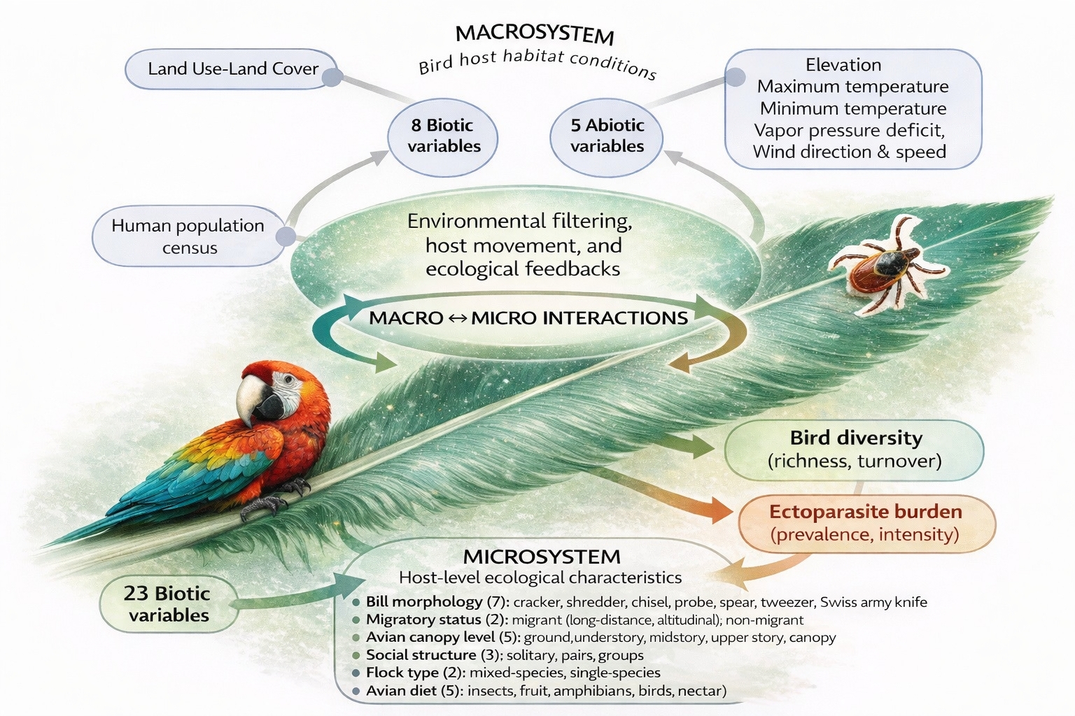 To understand tropical avian ectoparasitism, we analyzed bird–tick data and remote-sensing habitat metrics across the Colombian Andes (2008-2019), sampling 1,164 birds (204 species) across 15 localities (538-3121 m a.s.l.). Macrohabitat variables, land use/land cover (LULC), forest structure, and bioclimatic data were derived from Sentinel-2/CIAT raster products (5 km buffers); microhabitat variables comprised avian morphological and behavioral traits. Random Forest Models (RFMs) linked host and habitat factors to tick presence. Tick prevalence and host assemblages varied significantly by elevation and Andean region. Eastern Andean sites had the highest bird richness and tick infestation rates, whereas middle elevations had the lowest. Remote sensing revealed major LULC shifts over the study period. Forest decline and increased cropland/grassland, especially in the Western Andes, while Eastern sites showed a mixture of habitat loss and recovery. Macrohabitat models identified elevation and vegetation structure (Barren/Sparse vegetation, Closed shrublands) as strong predictors of tick presence (AUC = 95; R² = 62.3%). Microhabitat models highlighted host behavior and morphology (mixed-flock participation, bill shape, foraging strata) (AUC = 82.5%). The integrated model performed best (AUC = 98; R² = 76.4%), confirming that tick–bird dynamics are driven by combined environmental gradients and host traits. Our findings emphasize the value of multi-scale, remote-sensing-informed frameworks for predicting ectoparasite risk in complex tropical systems.