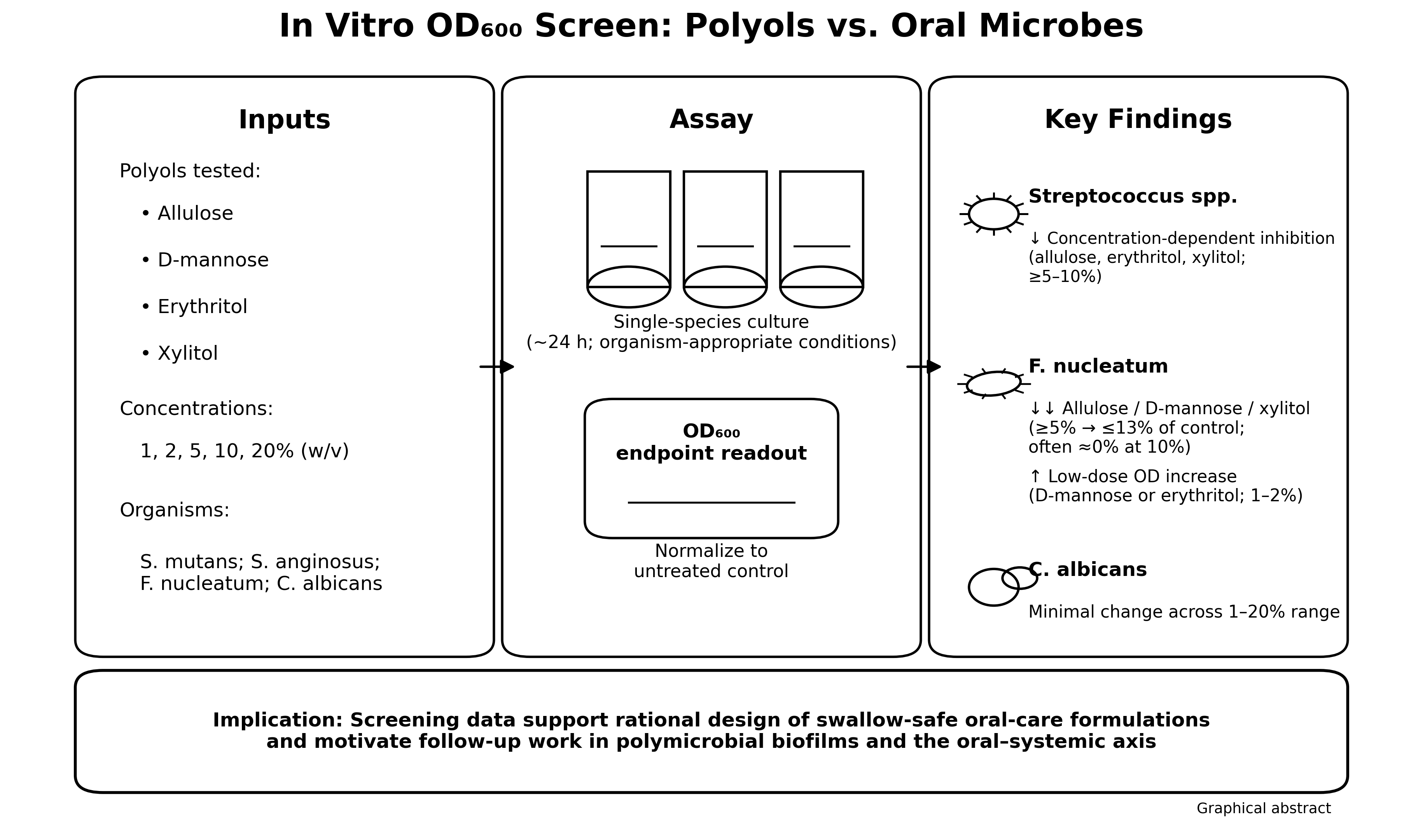 Polyols are widely used as non-cariogenic sweeteners in foods and oral care products, yet their comparative activity against diverse oral microbes and their potential relevance to the oral–systemic axis remain incompletely defined. Here, we performed an in vitro, optical-density (OD)-based screening of four polyols—allulose, D-mannose, erythritol, and xylitol—against Streptococcus mutans, Streptococcus anginosus, Candida albicans, and Fusobacterium nucleatum. Cultures were grown with polyols at 1–20% (w/v), and OD600 was recorded at organism-specific endpoints (~24 h). Allulose, erythritol, and xylitol produced strong, concentration-dependent suppression of streptococcal growth at ≥5–10%, whereas C. albicans showed minimal changes across the tested range. F. nucleatum was highly sensitive to allulose, D-mannose, and xylitol at ≥5% (reducing OD to ≤13% of untreated control), while low concentrations of D-mannose and erythritol increased OD above control, suggesting species-specific utilization or stress responses. One-way ANOVA with Tukey’s HSD post hoc testing supported significant between-polyol differences for most concentrations in Streptococcus spp. and F. nucleatum. Collectively, these results identify polyol- and taxon-specific growth phenotypes that can inform the formulation of swallow-safe oral hygiene products and motivate follow-up work in polymicrobial biofilm models and clinical studies targeting oral inflammation and downstream systemic risk.