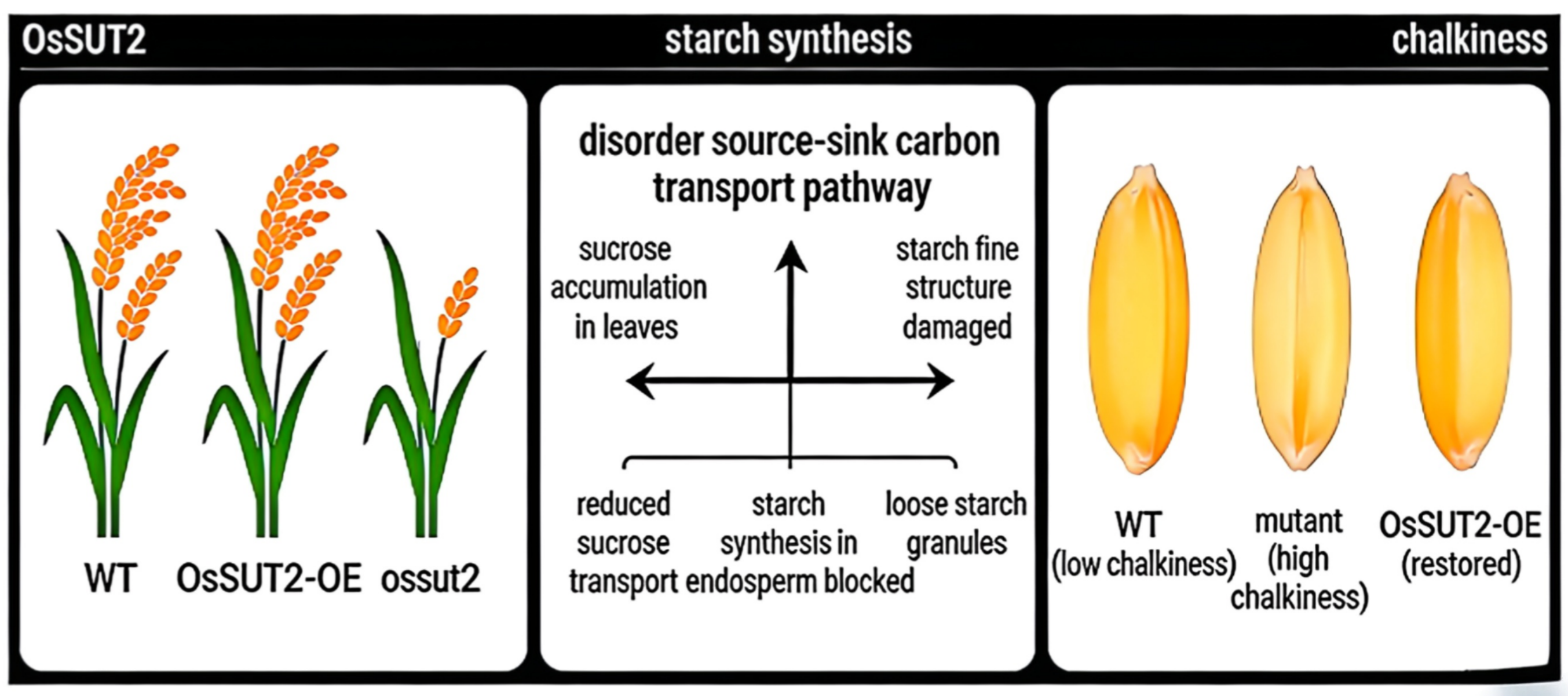 Rice chalkiness is a key constraint on high-quality rice breeding, and unbalanced sucrose transport and starch metabolism are its primary causes. To clarify the molecular mechanism by which OsSUT2 regulates rice grain chalkiness formation, the rice cultivar TP309 was used as material, and ossut2 homozygous mutants were generated via CRISPR/Cas9. Systematic studies were performed using gene overexpression complementation, phenotypic identification, cytological observation, transcriptome sequencing and haplotype analysis. Results showed that loss of OsSUT2 function significantly increased grain chalkiness, deteriorated agronomic traits, induced carbon assimilate accumulation in leaves, blocked sugar transport and starch synthesis in grains, and destroyed starch fine structure; normal phenotype was fully restored by OsSUT2 overexpression. OsSUT2 was expressed in both source and sink organs, with the most obvious inhibition detected in panicles. Mutation of OsSUT2 disordered sucrose and starch metabolic pathways. Three main haplotypes of OsSUT2 were identified in natural populations, with significant indica–japonica differentiation. OsSUT2 is confirmed as a key regulator of rice chalkiness, providing gene resources and theoretical support for rice quality improvement.