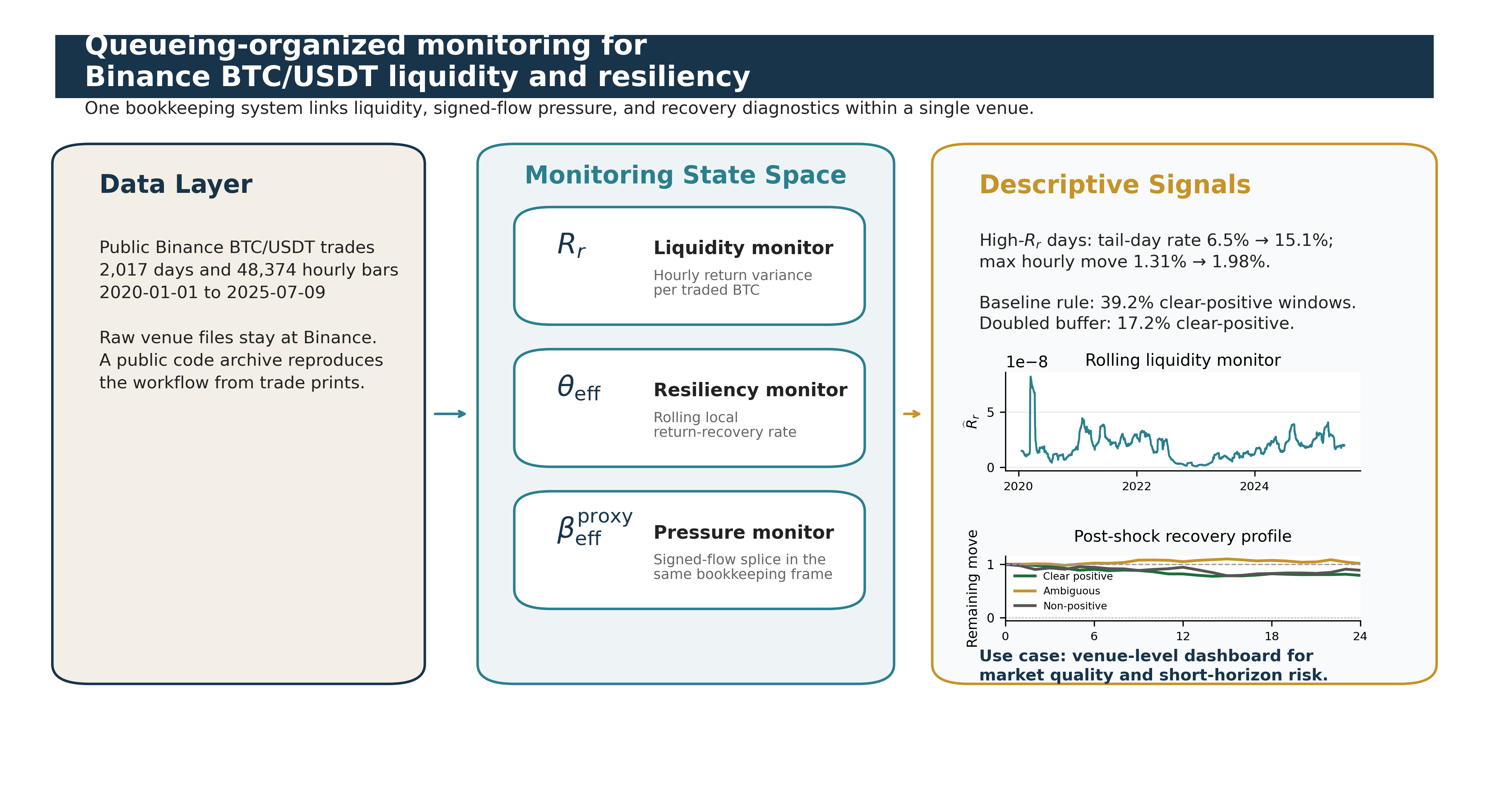 We develop a queueing-organized framework for within-venue monitoring of BTC/USDT liquidity, signed-flow pressure, and resiliency on Binance. The model treats latent buy and sell pressure as occupancy processes and uses that state space to organize three empirical diagnostics: the variance-per-BTC liquidity measure Rr, the effective mean-reversion rate θeff, and the companion signed-flow proxy betaproxyeff. Using Binance trade data from 2020 to 2025, we find a pooled first-order variance-volume regularity away from the highest-volume tail and substantial time variation in rolling liquidity and resiliency. In overlapping 30-day windows, θeff is positive by point estimate in roughly two-thirds of windows but clearly positive in only about two-fifths under a simple uncertainty buffer, implying that local recovery is often fragile or ambiguous. The intended users are short-horizon risk managers, execution desks, market makers, and exchange surveillance teams that need auditable venue-level indicators of when liquidity is thinning, recovery is weakening, and signed flow is turning one-sided. Queueing is useful here because it turns those signals into one coherent monitoring dashboard for venue-level market quality and short-horizon risk.