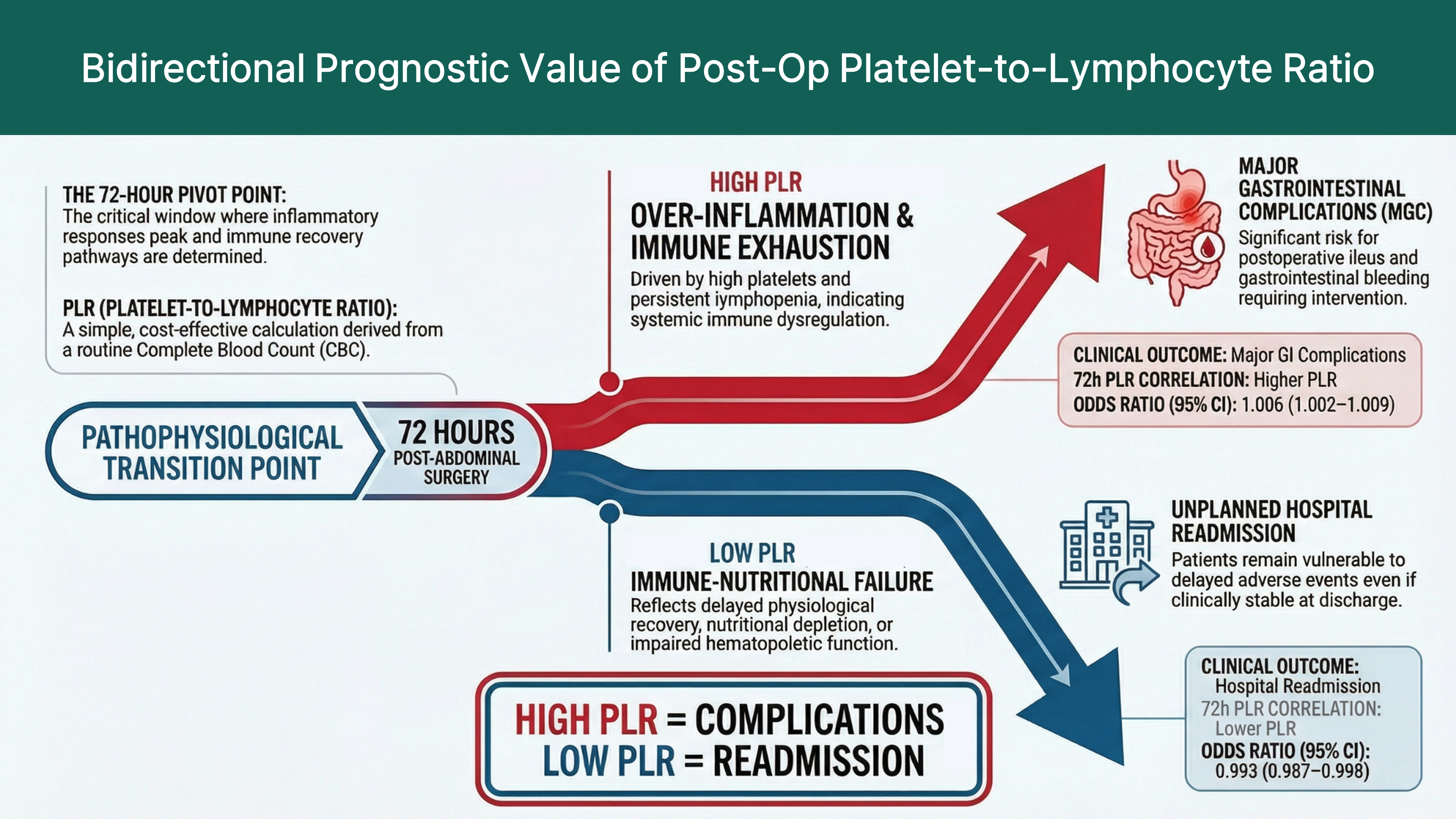 Background: Patients admitted to the intensive care unit (ICU) after major abdominal surgery are at high risk for gastrointestinal complications and unplanned hospital readmission. However, reliable and easily applicable biomarkers for early risk stratification are limited. This study evaluated the prognostic value of serial platelet-to-lymphocyte ratio (PLR) measurements in critically ill postoperative patients. Method: This retrospective observational study included adults admitted to the ICU after major abdominal surgery at a tertiary referral center between July 2020 and March 2025. The PLR was calculated from routine complete blood counts obtained at ICU admission and 24, 48, and 72 hours postoperatively. Multivariate logistic regression analysis was performed to identify the independent predictors of major gastrointestinal complications and hospital readmission rate. Results: Among 962 critically ill postoperative patients, nine (0.9%) developed major gastrointestinal complications. These patients had significantly higher disease severity scores and elevated PLRs at 72 hours postoperatively. In multivariate analysis, the PLR at 72 hours was an independent predictor of complications (odds ratio [OR] = 1.006; 95% confidence interval [CI]: 1.002–1.009). Conversely, a lower PLR at the same time point was independently associated with an increased risk of hospital readmission (OR = 0.993; 95% CI: 0.987–0.998). Conclusions: The postoperative PLR at 72 hours showed bidirectional prognostic value in critically ill patients after major abdominal surgery. Elevated PLRs were associated with major gastrointestinal complications, whereas lower PLRs were associated with hospital readmission. Thus, the PLR may serve as a practical biomarker for postoperative risk stratification and discharge decision-making in the ICU.