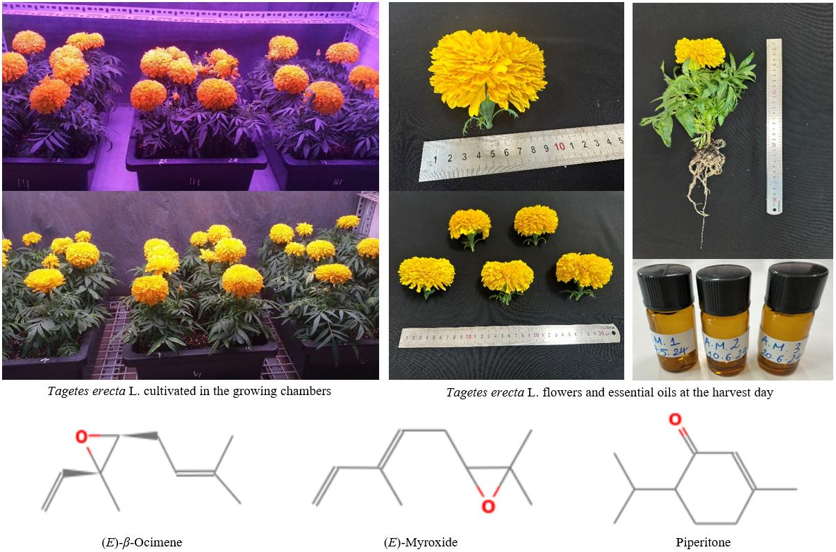 This study evaluated the effects of light spectral quality on shoot yield and essential oil of Tagetes erecta L. cultivated in controlled growth chambers. Plants were grown for up to 101 days under three LED lighting treatments with different red, blue, and white wavelength ratios and a constant 16 h photoperiod. The F2 treatment (5 red:1 blue) produced yields of fresh shoots, early blooming flowers, and oils of 271 ± 28 g/tray, 97.43 ± 13.14 g/tray, and 52.46 ± 5.41 mg/tray, respectively. These values were significantly higher (p < 0.05) than those of the F1 treatment (white:red-phosphor), and represented increases of 1.37-, 1.26-, and 1.38-fold, respectively. Gas chromatography identified three major oil constituents—(E)-β-ocimene (22.9–28.8%), (E)-myroxide (13.9–20.6%), and piperitone (7.3–9.6%)—among a total of 24—25 compounds. Essential oils inhibited from four to five of the seven tested microbial strains, with the notable activity against Escherichia coli and Candida albicans recorded in F2 and F1, respectively. These findings confirm that light spectral quality is a critical factor regulating flower, essential oil yield, and antimicrobial efficacy in T. erecta, and support the use of optimized LED spectra as a practical approach to improve plant’s yield and phytochemical quality.