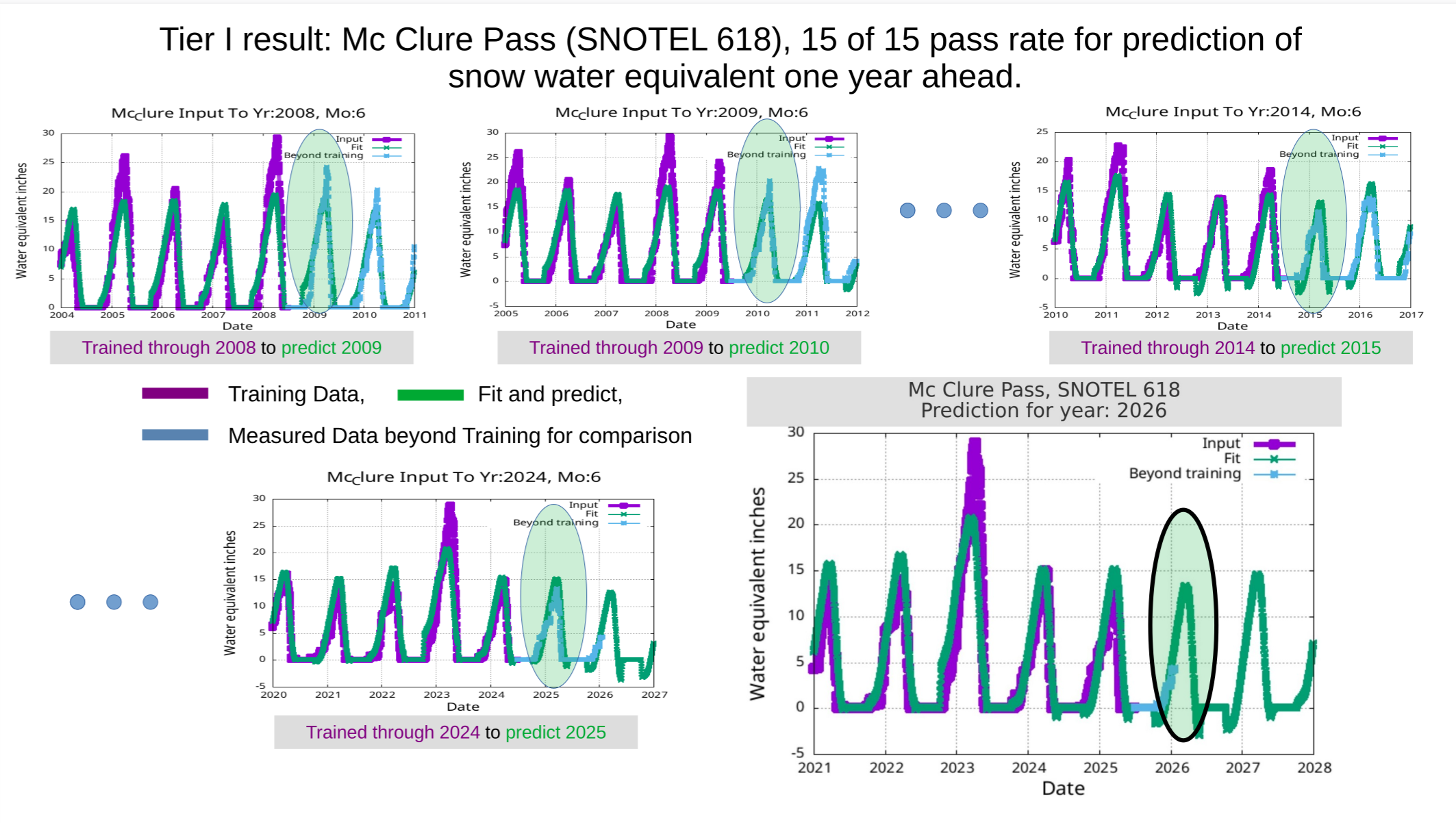 We describe a harmonic analysis system for predicting annual peak snow water equivalent (SWE) at SNOTEL monitoring stations operated by the Natural Resources Conservation Service (NRCS) across the western United States. The algorithm, frqsrchX, performs greedy harmonic regression on historical SWE records, identifying persistent periodic climate signals and superimposing volcanic impulse functions to account for episodic radiative forcing from major eruptions. A rigorous five-phase characterization pipeline applies distinct band-limited search strategies per site, and a two-winner selection system identifies optimal configurations by both maximum pass rate and a reliability score that balances accuracy with period stability. Validation uses out-of-sample holdout testing across 15–18 years (2008–2025), graded by an asymmetric scale that penalizes over-prediction more harshly than under-prediction. We report results for 771 SNOTEL and SNOW SENSOR stations across eight western states. Average pass rates range from 88.4% (Montana, 94 sites) to 49.3% (California, 122 sites, including 87 SNOW SENSOR stations). The three commercially targeted states—Colorado (113 sites), Montana (94 sites), and Wyoming (87 sites)—achieve average pass rates of 86.4%, 88.4%, and 84.2% respectively, with 84–90% of sites meeting the ≥80% operational pass-rate threshold using identical universal parameter search procedures and no state-specific tuning. Idaho (85 sites) and Washington (76 sites) show strong intermediate performance at 83.3% and 81.5%. Utah and Oregon show mixed results, while California falls well below operational thresholds. Period stability analysis indicates that 55–62% of qualifying sites in the five strongest states achieve stable signal detection, demonstrating consistent identification of physical climate periodicities. These results demonstrate that periodic climate signals—principally in the ENSO band (2,700–2,900 mY), a mid-range band (~6,000–7,500 mY), and an extended long-period band (10,500–17,000 mY)—carry actionable predictive information about annual peak snowpack at individual station scale.