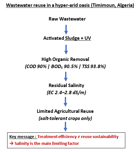 Today, the reuse of treated wastewater is considered an important and strategic driver for integrated and sustainable water and soil management in extremely arid desert regions, where significant constraints due to water scarcity, soil salinization, and the fragility of agricultural ecosystems within palm oases place a strain on all sustainable development policies. Through this study, we conducted a comprehensive evaluation of the performance of the treatment, as well as the constraints related to salinity and the implications for the land management of the activated sludge wastewater treatment plant located in the Timimoun desert oasis in southern Algeria. Through monthly monitoring over a 12-month period, we were able to perform an analysis of physicochemical, nutritional and microbiological parameters, as well as a seasonal analysis, in addition to calculating irrigation suitability indicators using first-order kinetic modeling of COD degradation. The results obtained showed high reduction rates for COD (90%), BOD5 (90,5%), and TSS (93.8%), confirming the resilience and effectiveness of biological treatment under very difficult and hostile climatic conditions. Furthermore, the ultraviolet disinfection process ensures microbiological quality that allows for reuse of treated water in agriculture. However, the residual salinity of this water remains a significant limiting factor for sustainable reuse, highlighting the need to integrate soil management strategies, crop selection, and irrigation management into regulatory frameworks for wastewater reuse. Therefore, this study provides us with important and useful scientific data for developing sound and sustainable water and land management policies in the harsh climate of Saharan oases.