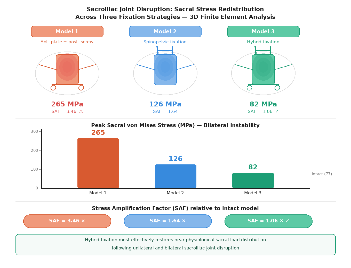 Background: Sacroiliac joint (SIJ) disruption alters posterior pelvic ring stability and may result in abnormal sacral stress redistribution. The biomechanical effects of different fixation strategies on sacral load transfer remain controversial. This study aimed to compare sacral stress patterns under unilateral and bilateral SIJ instability using three fixation techniques in a three-dimensional finite element model. Methods: A three-dimensional lumbosacral–pelvic finite element model was reconstructed from computed tomography data of a healthy adult and validated against previously published pelvic biomechanical data. SIJ instability was simulated by reducing the friction coefficient to represent ligamentous failure. Three fixation constructs were analyzed: anterior plate with posterior screw fixation, spinopelvic fixation, and hybrid fixation. A 750 N axial compressive load was applied to simulate static standing conditions; dynamic loading scenarios such as walking or sitting were not included. Peak sacral von Mises stress and stress amplification factors were calculated and compared with the intact model. Results: Anterior plate combined with posterior screw fixation produced the highest sacral stress amplification (SAF = 3.46 under unilateral instability; peak stress 265.40 MPa), exceeding three times the intact value, particularly under unilateral left instability (SAF = 3.46). Spinopelvic fixation significantly reduced peak sacral stress (125.66 MPa under bilateral instability; SAF = 1.64) but remained above physiological levels. Hybrid fixation demonstrated sacral stress values closest to the intact condition (81.64 MPa; SAF = 1.06), with minimal amplification and near-symmetrical load distribution. Conclusions: Fixation strategy significantly influences sacral load redistribution following SIJ disruption. Hybrid fixation most effectively restored near-physiological sacral stress patterns, whereas anterior plate with posterior screw fixation resulted in excessive stress concentration. Hybrid stabilization may provide a biomechanically balanced approach for unstable posterior pelvic injuries.