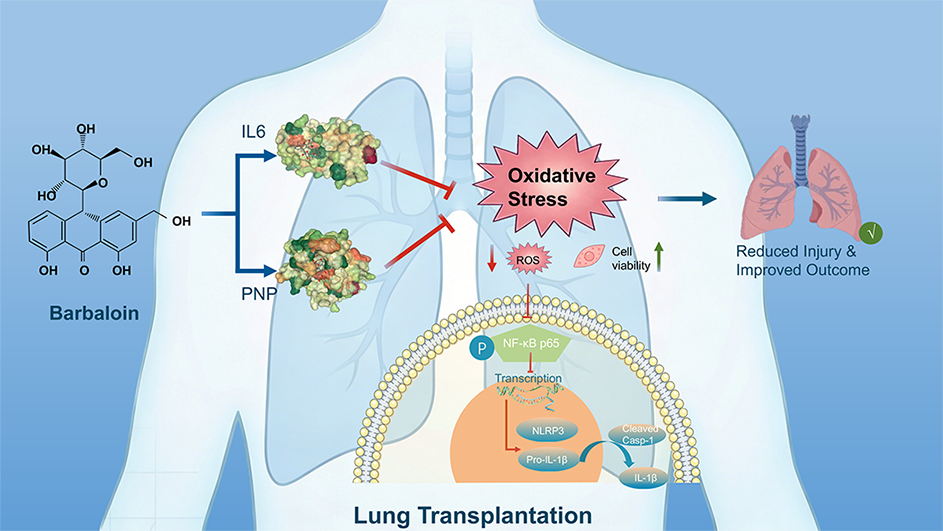 Ischemia-reperfusion injury (IRI) is a primary driver of graft dysfunction following lung transplantation, yet effective therapeutic strategies remain limited. Through integrated multi-omics analysis, target prediction, and experimental validation, this study identifies barbaloin as a potent dual-target agent that alleviates lung IRI by simultaneously inhibiting interleukin-6 (IL-6) and purine nucleoside phosphorylase (PNP). Mechanistically, barbaloin reduces intracellular Reactive Oxygen Species (ROS) accumulation by suppressing both IL-6 and PNP, thereby abrogating the ROS-dependent NF-κB/NLRP3 signaling cascade and subsequent immune-inflammatory responses. These findings highlight the pivotal role of the IL-6/PNP axis in mediating barbaloin’s antioxidant and anti-inflammatory effects. Furthermore, barbaloin’s favorable ADMET profile supports its potential as a novel therapeutic candidate for lung transplantation and other oxidative stress-driven inflammatory disorders.