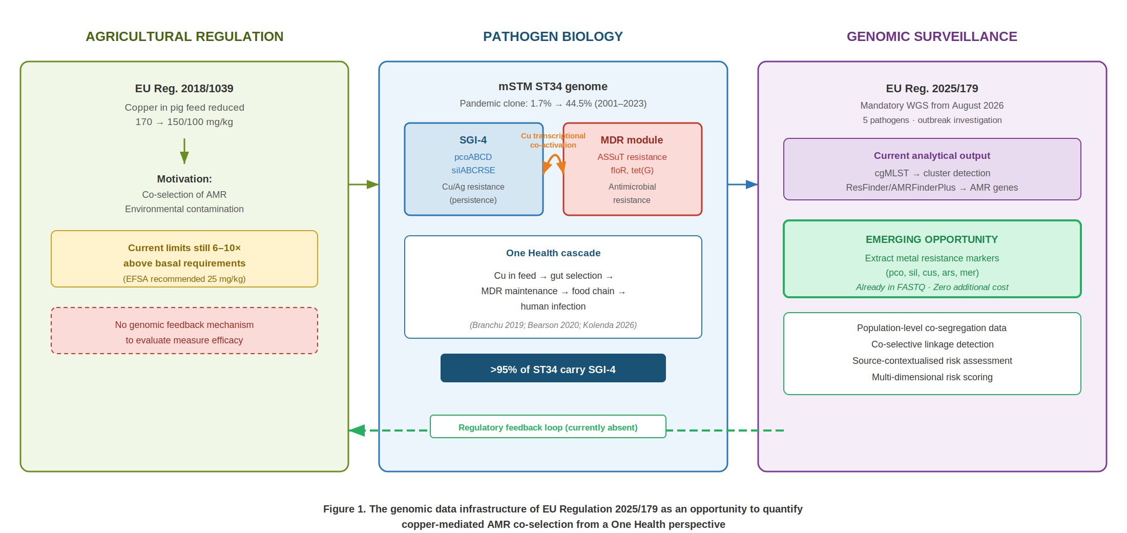 Copper supplementation in European pig production selects for the pandemic multidrug-resistant (MDR) monophasic Salmonella Typhimurium ST34 clone through Salmonella Genomic Island 4, which co-carries copper/silver resistance and antimicrobial resistance determinants on the same mobile genetic element — a paradigmatic example of non-antibiotic co-selective pressure connecting animal health, food safety, and public health under the One Health paradigm. EU Regulation 2025/179, which mandates whole-genome sequencing for foodborne outbreak investigation from August 2026, will generate an unprecedented genomic data infrastructure across Europe; this infrastructure contains, as an inherent by-product of sequencing, the metal resistance markers that would enable quantification of such co-selective pressures — a capability that extends beyond the outbreak detection purpose for which it was conceived. Multi-dimensional genomic risk assessment frameworks integrating virulence, environmental persistence, and antimicrobial resistance into quantitative actionable indices represent a pathway to realise this opportunity, connecting copper reduction in animal feed (Regulation 2018/1039) with genomic surveillance (Regulation 2025/179) along a One Health continuum from farm to patient.