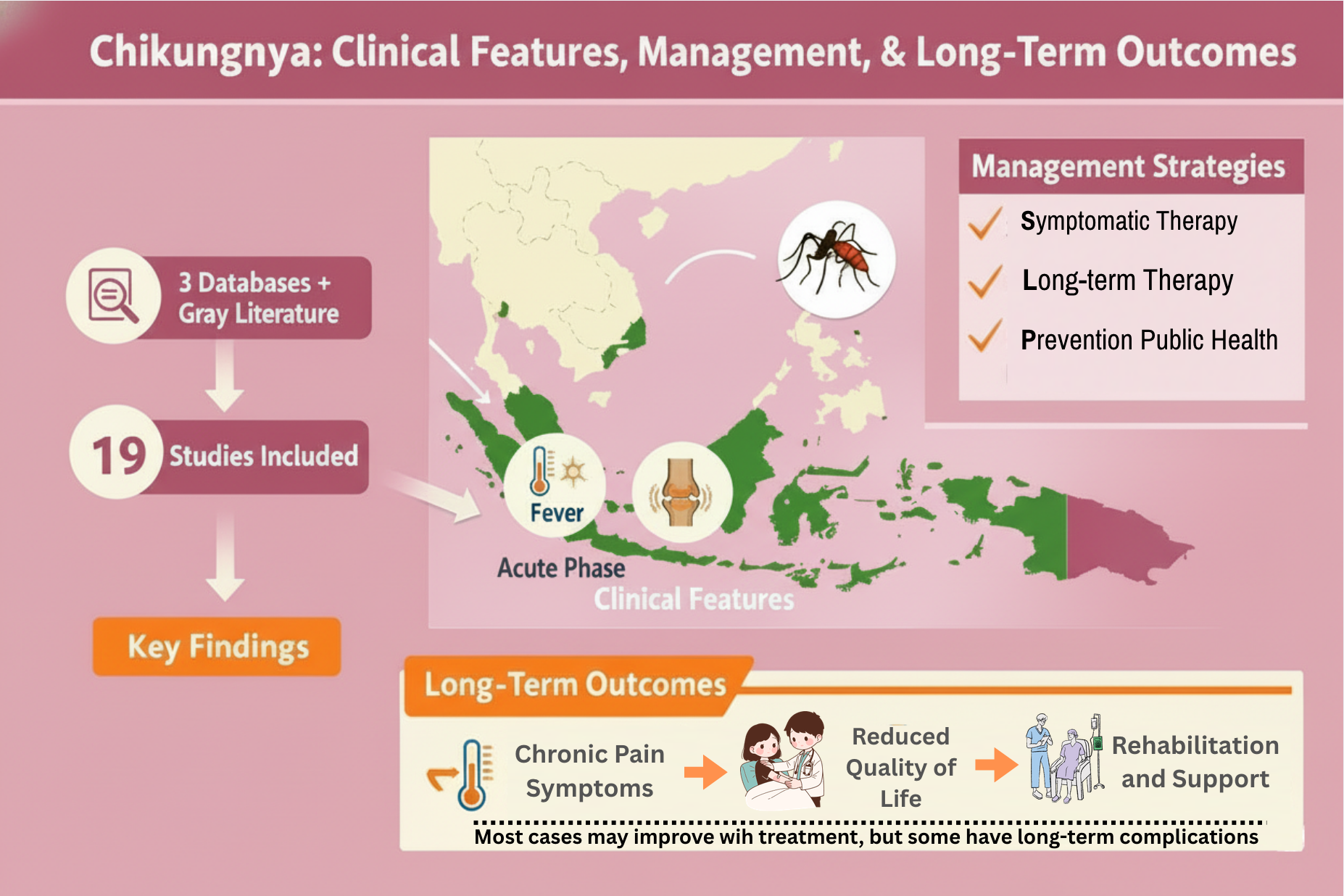 Chikungunya poses a tough challenge because of its varied symptoms and frequent misdiagnosis. Inappropriate treatment can affect long-term patient outcomes. This review aims to identify clinical features, current management and therapeutic strategies, and long-term clinical outcomes of Chikungunya disease. This scoping review, reported according to the JBI and PRISMA-ScR guidance. This study was conducted from three databases as primary data sources and several of gray literatures. From 19 studies were included in this review, fever and joint symptoms were reported as the main clinical features of acute Chikungunya infection, which may persist and become chronic, then affecting the patient’s quality of life. The primary management of Chikungunya infection, include symptomatic and long-term therapy. Preventions and public health management also play a role. In conclusion, most cases of Chikungunya may improve with treatment, but some have long-term complications that require rehabilitation, support, prevention, and public health management.