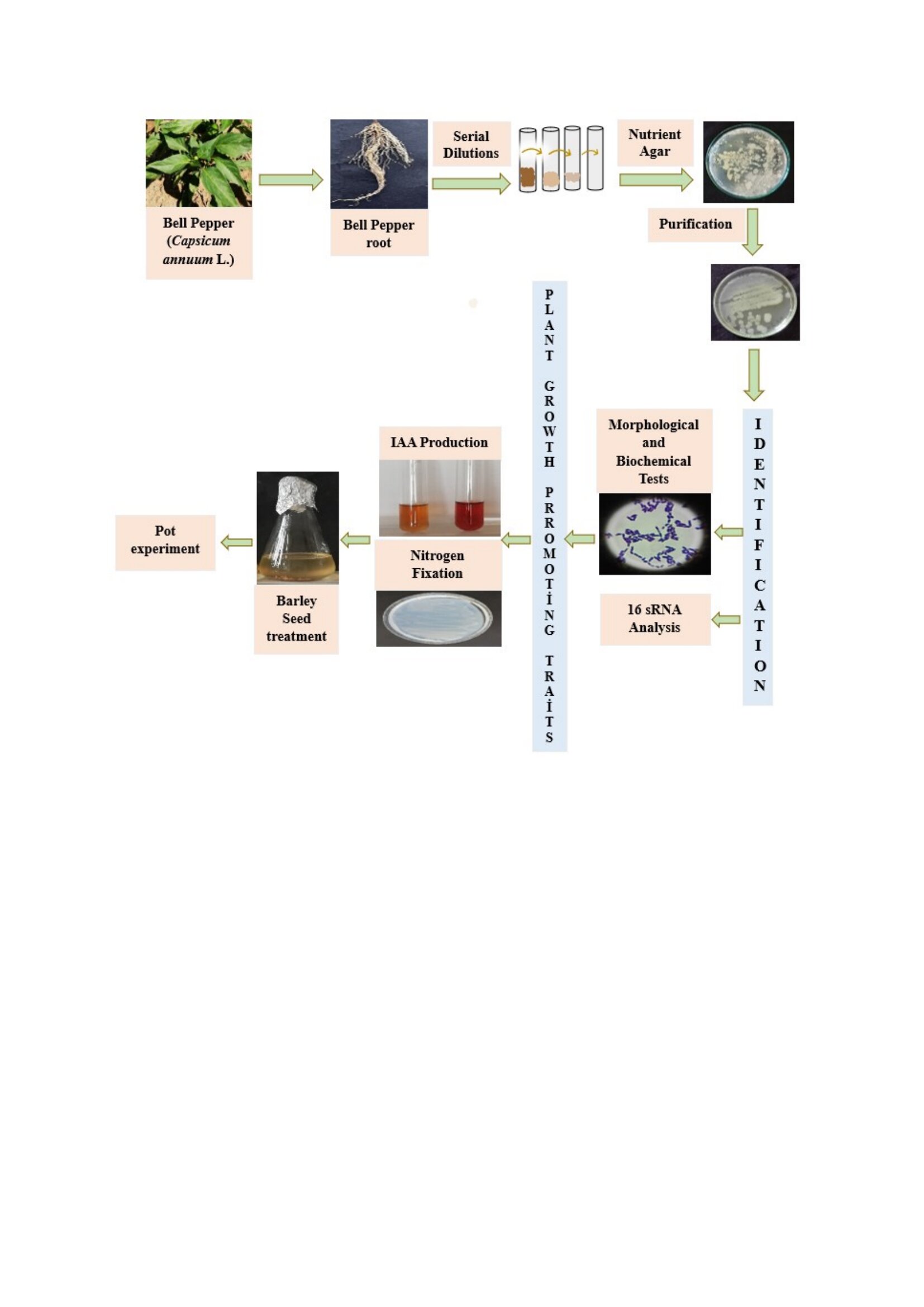 Endophytic bacteria are beneficial microbes that live within plant tissues and promote growth through nitrogen fixation, phosphate solubilization, and phytohormone production. Two endophytic isolates from bell pepper (Capsicum annuum L.) root were identified based on their morphology, and biochemistry properties using 16S rRNA gene sequencing. Winter barley (Hordeum vulgare L.) seeds were inoculated with two PGP (plant growth-promoting) bacterial strains (C-14 and C-27), previously characterized for IAA production and nitrogen fixation, and evaluated in a pot experiment with four treatments: A1(C-14), A2 (C-27), A3 (their consortium), and A4 (non-inoculated control). The results indicated that root and stem lengths increased in plants inoculated with bacteria compared to the uninoculated control. Among treatments, A2 produced the greatest root and shoot lengths (17.23 and 26.2 cm), while A3 showed the lowest (15.8 and 21.5 cm). SPAD values also increased by 6%, 10%, and 3.2% in A1, A2, and A3, respectively. This study clearly demonstrated that the endophytic isolates (C-14 and C-27) obtained from bell pepper roots significantly enhanced the growth and development of barley due to their abilities of IAA production and nitrogen fixation, thereby offering a promising alternate to chemical fertilizers.