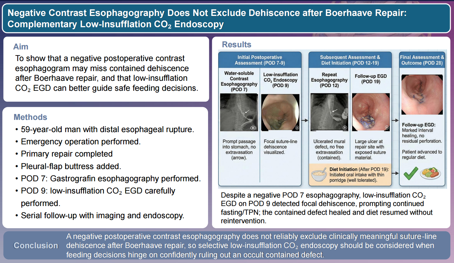 After repair of Boerhaave syndrome, assessment of repair integrity is important because occult dehiscence may progress to mediastinitis or pleural sepsis. Water-soluble contrast esophagography is commonly used before resuming oral intake, but absence of contrast extravasation does not necessarily exclude a small or contained defect. We report a 59-year-old man with post-emetic distal esophageal rupture who underwent emergency primary repair with pleural-flap buttress and drainage. Although he remained clinically stable, water-soluble contrast esophagography on postoperative day (POD) 7 showed no extravasation. Because feeding decisions required greater structural confidence, low-insufflation carbon dioxide (CO2) esophagogastroduodenoscopy (EGD) was performed on POD 9 and revealed focal suture-line dehiscence. Oral intake was deferred, and conservative management with fasting and total parenteral nutrition was continued. Serial reassessment suggested a contained defect, and oral intake was reintroduced cautiously. A regular diet was started only after POD 28 endoscopy showed marked interval healing, and follow-up endoscopy at 3 months confirmed complete mucosal healing. This case highlights that negative postoperative contrast esophagography does not exclude persistent dehiscence and that low-insufflation CO2 endoscopy may provide useful complementary structural information in selected patients.