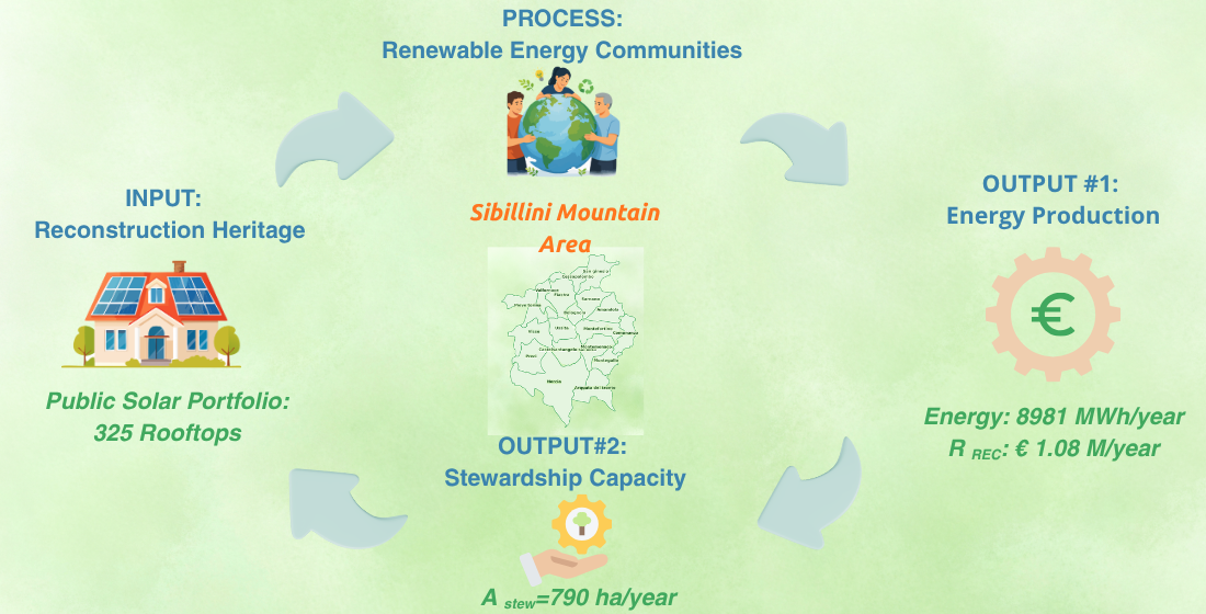 The primary aim of this study is to quantify the untapped solar potential of the public reconstruction sector within the Sibillini Mountains cluster and to propose a self-funding Stewardship-Renewable Energy Communities (RECs) model. We hypothesize that by leveraging the newly reconstructed public building stock as a solar backbone, mountain municipalities can generate an economic surplus dedicated to the active maintenance of the surrounding landscape. To achieve this, the research addresses the following key questions: