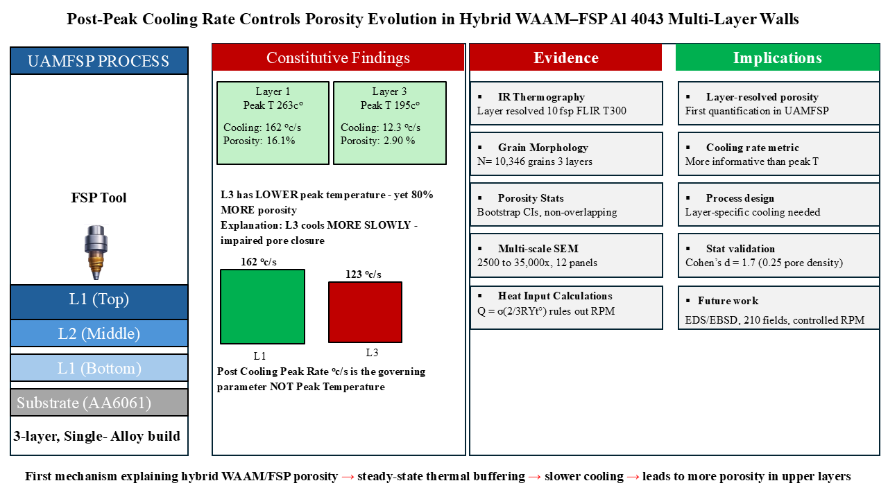 - The primary technological implication of this first mechanistic framework is that post-peak cooling rate warrants explicit management on a layer-by-layer basis in UAMFSP multi-layer builds. Active post-FSP cooling, substrate pre-cooling, or layer-specific traverse speed optimization represent practical engineering pathways that can be employed to reduce upper-layer porosity while maintaining the grain refinement benefits established at lower layers. More broadly, the finding that the post-peak cooling rate governs defect consolidation quality is expected to be relevant to similar hybrid AM systems in which interlayer heat accumulation progressively modifies the solid-state post-processing thermal environment, suggesting that the present findings may have value beyond the specific UAMFSP configuration examined here; however, direct validation in other hybrid AM systems is needed before broader generalization.