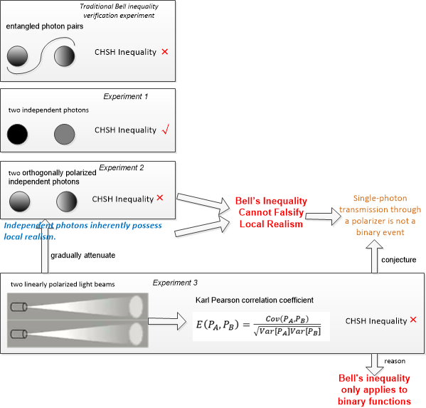 Conventional tests of Bell’s inequality rely on entangled photon pairs. Here, we replace entangled pairs with two independent photons of orthogonal polarization, and demonstrate that Bell’s inequality is still violated. Given the inherent local realism of independent photons, this experiment proves that Bell’s inequality cannot falsify the local realism of photons. We thus conjecture that the violation of Bell’s inequality by entangled photon pairs originates from their orthogonal polarizations, rather than the breakdown of local realism. To interpret this unexpected violation with independent photons, we further substitute the two photons with two monochromatic light beams, and calculate the transmittance correlation through polarizers via Malus’s law and Karl Pearson’s correlation formula. We show that this correlation also defies Bell’s inequality. Retracing the derivation of Bell’s inequality reveals its validity is restricted to binary events, which accounts for the observed violation with light beams. Finally, we propose a thought experiment involving gradual attenuation of light intensity down to the single-photon regime, and hypothesize that single-photon transmission through a polarizer does not constitute a binary event. This hypothesis provides a unified interpretation for both our experimental findings and all canonical Bell inequality tests reported to date.