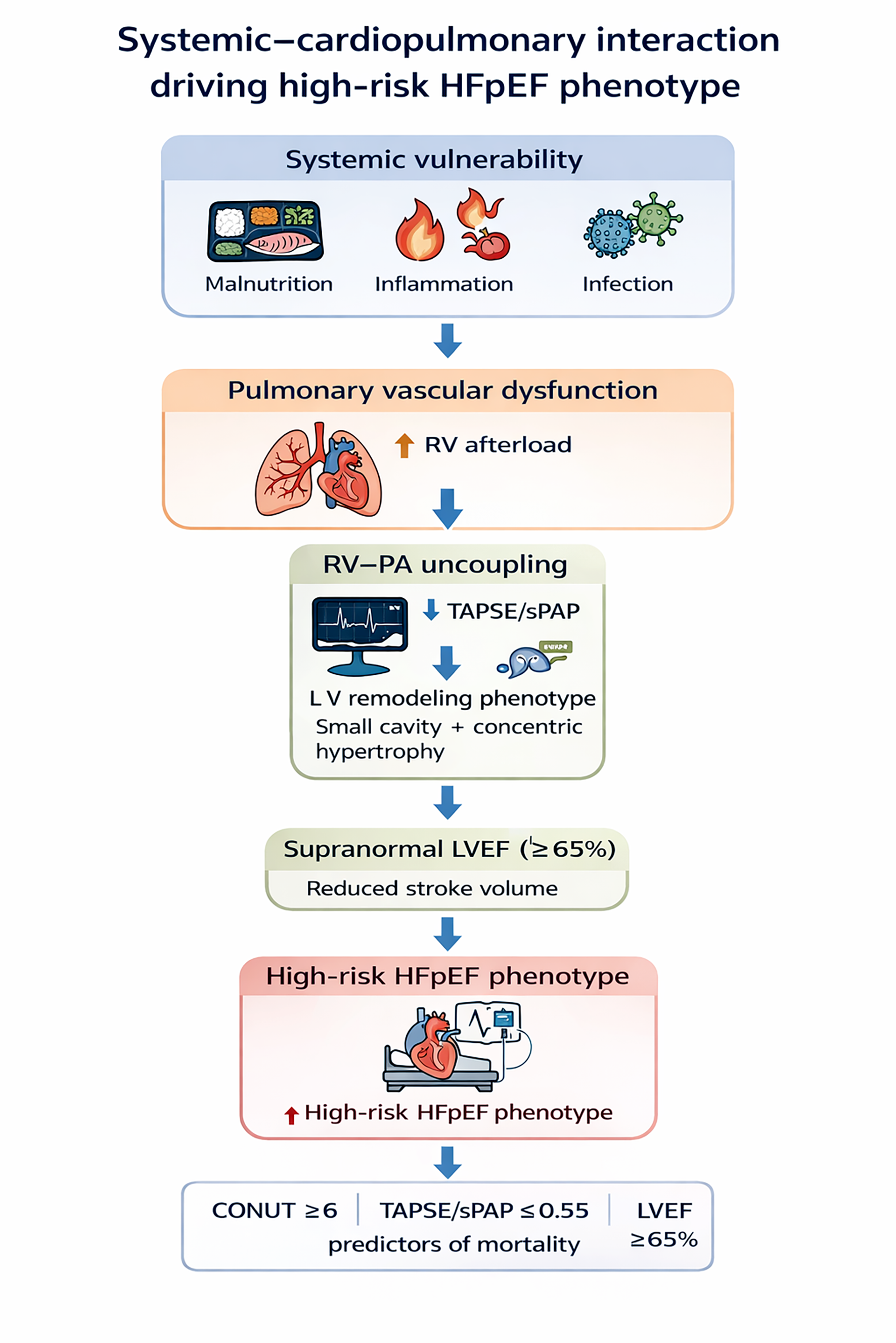 Background: Malnutrition and systemic inflammation are increasingly recognized as important determinants of prognosis in patients with heart failure. Several immuno-nutritional indices, including the Prognostic Nutritional Index (PNI), the Controlling Nutritional Status (CONUT) score, and the C-reactive protein–albumin–lymphocyte (CALLy) index, have been proposed as markers of nutritional and inflammatory status. However, their prognostic value in elderly patients with heart failure with preserved ejection fraction (HFpEF) remains incompletely defined. This study aimed to evaluate the prognostic significance of these immunonutritional indices in elderly patients with HFpEF over a long-term follow-up period. Methods: This retrospective observational study included 200 elderly patients hospitalized with HFpEF (mean age 86.6 ± 6.5 years). Clinical, laboratory, and echocardiographic parameters were collected at admission. Nutritional status was assessed using PNI, CONUT score, and CALLy index. Patients were followed for mortality during long-term follow-up. Survival analyses were performed using Cox regression models, receiver operating characteristic (ROC) curves, and Kaplan–Meier analysis. Median follow-up was 3.8 years (IQR 2.1–5.9). Results: During follow-up, 123 patients (61.5%) died, while 77 patients (38.5%) were alive at the end of observation. In univariate analysis, PNI, CONUT score, left ventricular ejection fraction (LVEF), and the tricuspid annular plane systolic excursion to systolic pulmonary artery pressure (TAPSE/sPAP) ratio were significantly associated with mortality. In multivariate analysis, the CONUT score, LVEF, and the TAPSE/sPAP ratio remained independent predictors of mortality. ROC analysis showed strong prognostic performance for the TAPSE/sPAP ratio (AUC 0.932), CONUT score (AUC 0.925), and LVEF (AUC 0.897). Optimal cut-off values for mortality prediction were CONUT ≥6, LVEF ≥65%, and TAPSE/sPAP ≤0.55. Kaplan–Meier analysis confirmed significantly reduced survival among patients with higher CONUT scores, higher LVEF, and an impaired TAPSE/sPAP ratio. Conclusions: In elderly patients with HFpEF, nutritional status and cardiopulmonary functional parameters are important determinants of long-term prognosis. The CONUT score emerged as the most informative immunonutritional index, while echocardiographic parameters reflecting ventricular function and right ventricular–pulmonary arterial coupling provided additional prognostic information. Integrating nutritional assessment with echocardiographic evaluation may improve risk stratification in elderly patients with HFpEF.