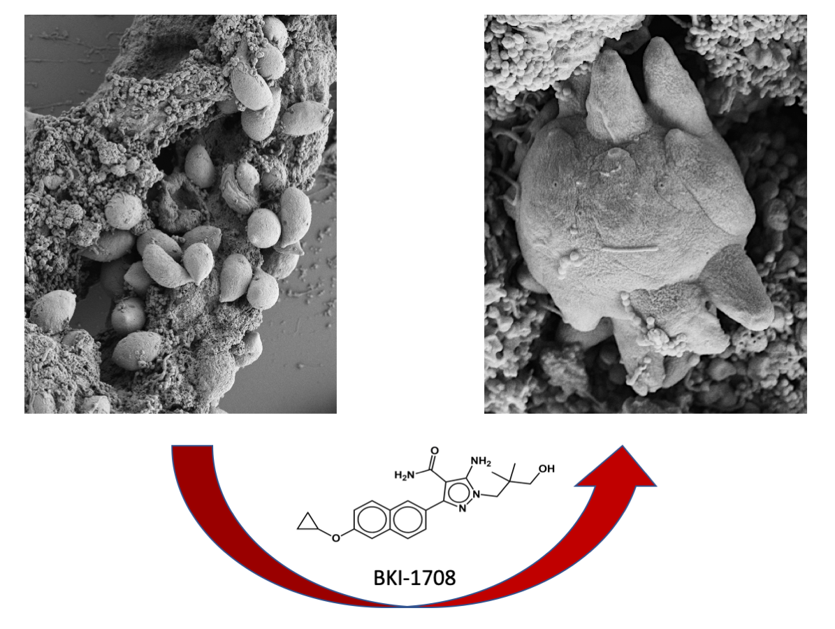 - de Sousa, M.C.F.; Müller, J.; Hänggeli, K.P.A.; Heller, M.; Uldry, A.-C.; Braga-Lagache, S.; Leitao, A.; Ortega-Mora, L.-M.; Ojo, K.K.; Van Voorhis, W.C.; et al. Bumped Kinase Inhibitor BKI-1708 Interferes in Cytokinesis and Drives Baryzoite Conversion in the Cyst-Forming Apicomplexan Parasites Toxoplasma Gondii, Neospora Caninum and Besnoitia Besnoiti. International Journal of Molecular Sciences 2026, 27, 2914. [CrossRef]