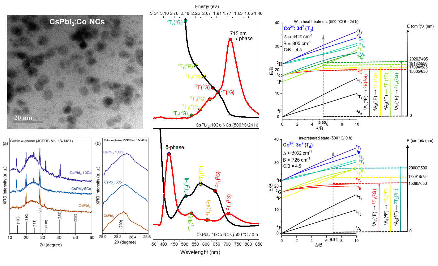 Co²⁺-doped CsPbI₃ nanocrystals (NCs) (CsPbI₃:xCo, x = 0, 0.05, and 0.10 mol%) were synthesized in situ within a borosilicate glass matrix by the fusion method followed by controlled thermal treatment at 500 °C for 6–24 h. Transmission electron microscopy images showed quasi-spherical NCs formed within the glass matrix with mean diameters ranging from 6.3 to 8.4 nm, consistent with diffusion-mediated growth under glass nanoconfinement. Energy-dispersive X-ray spectroscopy confirmed the presence of Co within the NCs regions. X-ray diffraction patterns confirm the exclusive stabilization of the cubic α-phase across all compositions, with a systematic shift of the (200) reflection to greater angles with increasing Co content, evidencing B-site lattice contraction due to the substitution of Pb²⁺ by Co²⁺. Optical absorption and photoluminescence spectra demonstrate that Co²⁺ incorporation enhances the δ-phase emission in the as-prepared condition, consistent with defect passivation, and that progressive thermal treatment stabilizes band-edge excitonic emission near ~1.74 eV without disrupting the fundamental optical response of the α-CsPbI₃ host. Crystal field theory and Tanabe–Sugano analysis for d⁷ ions in Td symmetry yielded Δ = 5032 cm⁻¹ and B = 725 cm⁻¹ in the as-prepared state, evolving to Δ = 4428 cm⁻¹ and B = 805 cm⁻¹ after thermal treatment, confirming the tetrahedral coordination of Co²⁺ and significant metal–iodide covalency. These results position CsPbI₃:xCo NCs embedded in glass as robust platforms for glass-integrated photonic applications.