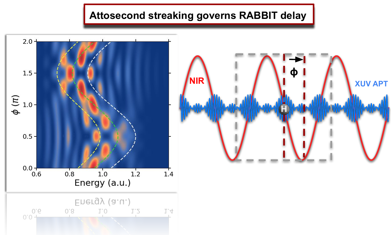 We present a theoretical study focused on the photoelectron spectrum of near-infrared (NIR) laser-driven ionization of hydrogen atoms by attosecond pulse trains composed of several high-order harmonics of the former. We analyze the effects of increasing the intensity of the NIR probe laser to account for the interference of multiple quantum pathways arising from mainbands formed in ionization by the attosecond pulse train within the strong-field approximation (SFA) beyond the commonly used first-order perturbative (in the NIR laser intensity) reconstruction of attosecond beating by interference of two-photon transitions (RABBIT). The structure of the energy bands formed in the photoelectron spectrum is governed by quantum interferences of the photoelectron wave packet released within one optical cycle of the NIR probe laser field –intracycle interference– and by the number of active high harmonic components, leading to higher-order Fourier contributions as a function of the NIR–XUV relative phase delay. Our results demonstrate a significant departure from the standard two-path quantum-interference RABBIT picture, showing that both the phase-dependent oscillations of mainbands and sidebands and the extracted phase delays depend strongly on the probing laser intensity. The predictions of the SFA reveal that the above-threshold ionization bands exhibit systematic splitting and oscillation patterns as a function of the NIR intensity. SFA predictions are compared with results obtained within ab initio solutions of the time-dependent Schrödinger equation (TDSE), showing an excellent agreement, which evidences that the negligible effect of the Coulomb potential of the remaining ion on the escaping photoelectron for high energy above-threshold ionization. These findings provide new insights into attosecond chronoscopy in the strong-field regime.