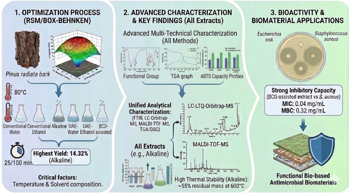 Conventional and emerging extraction methods for recovering phenolic compounds (PCs) from Pinus radiata bark were investigated for their potential use in bio-composites and bio-based biomaterial applications. To optimize the recovery process, a Response Surface Methodology (RSM) based on a Box-Behnken design was used to evaluate the effects of extraction time (20–100min), temperature (20–80°C), and water or ethanol-water solvent concentrations with β-cyclodextrin (βCD) or NaOH (0.5–1.5% w/v CD/db). Polyphenolic profiles of the extracts were characterized using Fourier transform infrared spectroscopy (FTIR), LC-LTQ-Orbitrap-MS, and matrix-assisted laser desorption/ionization time-of-flight mass spectrometry (MALDI-TOF-MS). Thermogravimetric analysis (TGA) and differential scanning calorimetry (DSC) were used to evaluate the thermal stability and degradation behavior of the powdered extracts. Antioxidant capacity (DPPH, FRAP, ABTS) and antibacterial activity against Escherichia coli and Staphylococcus aureus were assessed by spectrophotometric assays and the agar diffusion method, respectively. Highest extraction yields were obtained using alkaline extraction (14.32%) and ultrasound-assisted extraction (UAE) (13.86%), followed by ethanol extraction (12.74%). Minimum inhibitory concentration (MIC) for P-βCD was 0.04 mg/mL and the minimum bactericidal concentration (MBC) was 0.32 mg/mL against S. aureus. These results suggest a strong inhibitory capacity at low concentrations and the potential incorporation of these extracts into bio-based antimicrobial biomaterials.