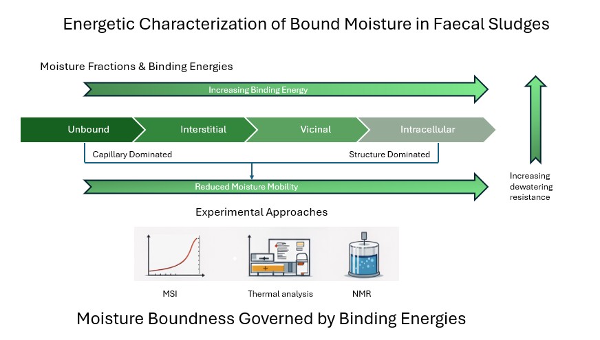 In faecal sludges (FS) from non-sewered sanitation systems, bound moisture consti-tuted 46-67% of total moisture across all sanitation types investigated, yet the energet-ic basis for its resistance to removal has not previously been characterized. Existing classifications of moisture fractions lack quantitative binding energy data, leaving the thermodynamic limits of solid–liquid separation undefined for FS. This study investi-gates the distribution and binding energies of bound moisture fractions in FS obtained from ventilated pit latrines, urine-diverting dehydrating toilets, and septic tank sys-tems. Bound moisture fractions were determined using moisture sorption isotherms, low-temperature convective drying, nuclear magnetic resonance, and thermogravi-metric–differential scanning calorimetry analyses. Results show that interstitial mois-ture constituted 37–50% of total moisture, followed by vicinal (6–14%) and intracellu-lar (3–9%) fractions, with net isosteric heat rising sharply below 20–30% moisture content (w.b.). Evaporation enthalpy exceeded that of bulk water at moisture contents below ~30% (w.b.), consistent with EPS-mediated adsorption and capillary confine-ment contributing to increased energy requirements for moisture removal and indi-cating a transition from capillary-controlled to structure-influenced retention. These findings provide a thermodynamic basis for interpreting why conventional mechani-cal dewatering stalls at a residual moisture content that differs systematically between VIP, UDDT, and septic tank sludges. These insights are relevant for improving FS treatment strategies, particularly in selecting appropriate combinations of dewatering, drying, and pre-treatment processes.