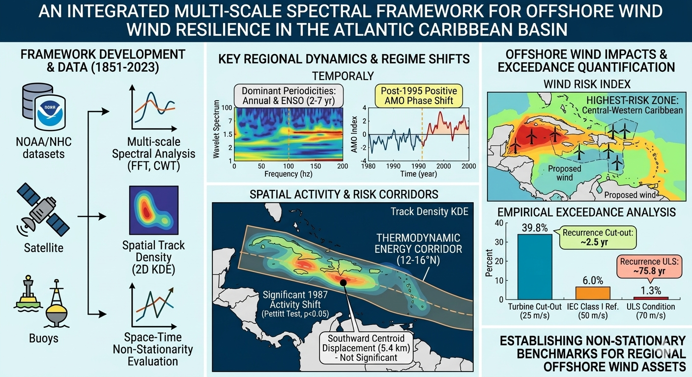 The development of offshore wind energy in tropical cyclone-prone regions requires analytical frameworks that capture non-stationary climate dynamics. This study presents a multi-scale spectral approach to characterize Atlantic tropical cyclone variability and assess implications for offshore wind resilience in the Caribbean Basin. The methodology integrates Fast Fourier Transform (FFT) and Continuous Wavelet Transform (CWT) to resolve temporal variability in sea surface temperature, cyclone frequency, and intensity, complemented by two-dimensional kernel density estimation (KDE) and non-stationarity analysis. Using NOAA and National Hurricane Center datasets, results identify dominant periodicities at annual and ENSO (2–7 year) scales, a post-1995 spectral energy shift associated with the positive AMO phase, and a thermodynamically consistent energy corridor along 12-16°N. A statistically significant change point in 1987 (Pettitt test, p < 0.05) is detected, although spatial displacement is not significant. An integrated Wind Risk Index highlights the central-western Caribbean as a high-exposure zone overlapping offshore wind development areas. Exceedance analysis shows that 39.8% of observations surpass 25 m/s, 6.0% exceed 50 m/s, and 1.3% approach 70 m/s, indicating relevant design considerations. These findings support the need for non-stationary, multi-scale approaches in offshore wind risk assessment under tropical cyclone influence.