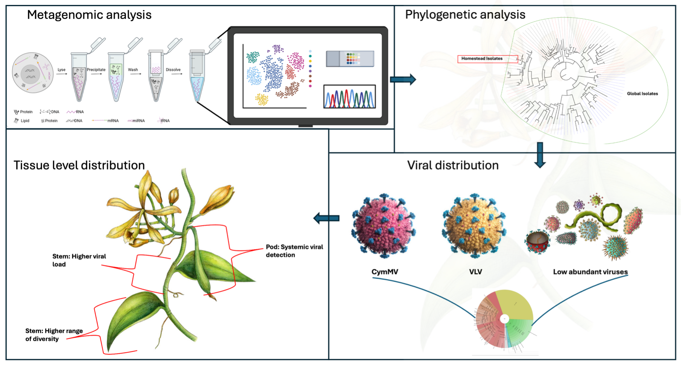 Vanilla planifolia, a high-value tropical orchid, is significantly impacted by viral pathogens that threaten its cultivation and productivity. This study employs metagenomic technique to detect and characterize the viral communities associated with V. planifolia in south Florida. Using high-throughput RNA sequencing, the Cymbidium mosaic virus (CymMV) and Vanilla latent virus (VLV) were prevalent in the plant system, with CymMV being the dominant viral species. Phylogenetic analysis of the CymMV coat protein gene revealed notable genetic divergence in the Homestead isolate, forming a distinct clade from global reference strains, suggesting local adaptation or host-specific evolution. Viral distribution across plant system revealed higher viral loads in stem tissue, consistent with their role in systemic transport, whereas leaves exhibited greater viral diversity, likely due to in-creased environmental exposure. The low abundance of other viral species, including Garlic viruses and Senna severe yellow mosaic virus, highlights the complex viral ecology associated with V. planifolia. This study underscores the value of metagenomic approaches for uncovering both well-characterized and novel viruses in plant systems and highlight the need for continuous viral surveillance to guide disease management strategies in economically important crops such as vanilla.