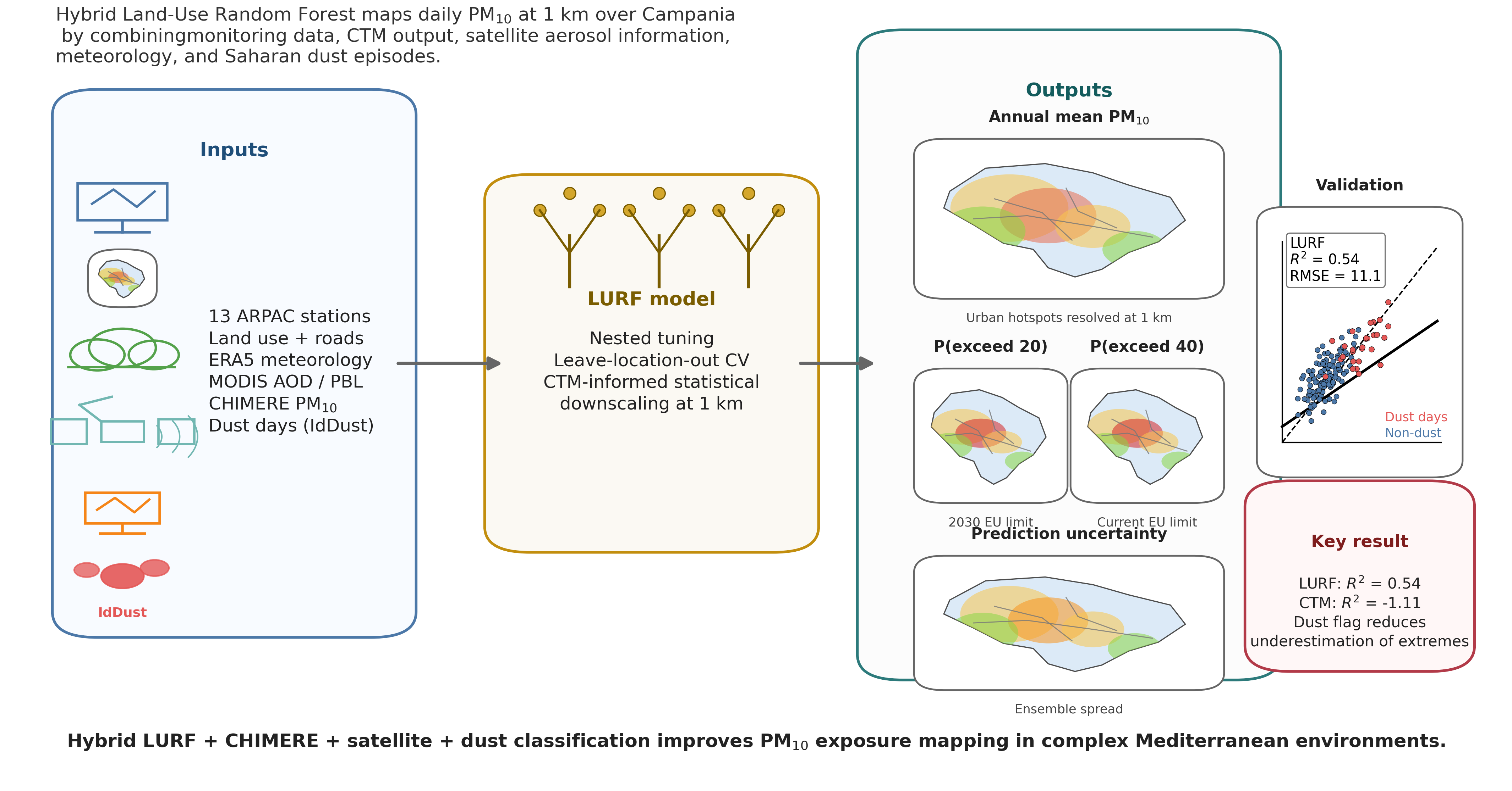 In this study we develop a Land-Use Random Forest (LURF) model for the Campania Region (southern Italy) that combines 2022 daily PM10 observations from 13 quality-controlled ARPA Campania stations with a rich set of spatial predictors to produce daily concentration maps at 1000 m × 1000 m resolution, from which annual statistics (mean, percentiles, and exceedances) are derived through temporal aggregation. The predictor space includes resident population, land-cover and imperviousness indicators, road-network metrics derived from OpenStreetMap, meteorological fields from the ERA5 reanalysis, satellite aerosol optical depth (AOD) from MODIS Terra and Aqua—scaled by ERA5 boundary-layer height (AOD/pbl)—daily mean PM10 from a nested CHIMERE simulation, and a binary categorical predictor (IdDust) flagging days affected by Saharan dust transport events. The hyperparameters for the LURF model are selected via a nested inner grid search; generalisation performance is assessed through a spatially aware leave-location-out cross-validation (LLO-CV) scheme, which prevents optimistic bias arising from spatial autocorrelation among neighbouring stations. Under LLO-CV, the LURF achieves R2=0.54, RMSE =11.1 μg m−3, and MAE =8.0 μg m−3, against R2=−1.11, RMSE =23.6 μg m−3, and MAE =19.1 μg m−3 for the raw CHIMERE output evaluated on the same observations. The inclusion of IdDust as a categorical covariate allows the Random Forest to partition the training distribution between dusty and non-dusty regimes, improving the representation of episodic high-PM10 events and reducing systematic underestimation at the upper tail of the concentration distribution. CTM-derived PM10 and ERA5 boundary-layer and pressure fields emerge as the dominant predictors, collectively accounting for the majority of explained variability, while IdDust ranks among the physically interpretable secondary predictors. The 1000 m maps highlight marked urban–rural contrasts, resolving hotspots in the Naples metropolitan area and along major motorway corridors that remain unresolved at typical CTM grid spacings. By embedding physically based CTM output, satellite aerosol diagnostics, and dust-event classification within a flexible machine-learning framework, the proposed approach offers a low-cost, operationally tractable tool for high-resolution PM10 exposure assessment in regions characterised by complex terrain and heterogeneous emission sources.